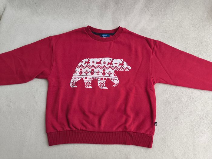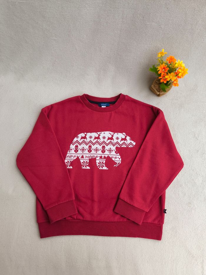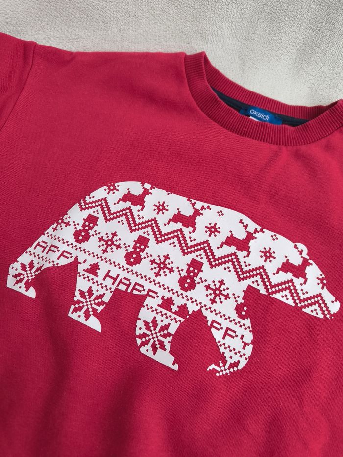 Pull / Sweat à manches longues Marque Okaïdi Taille 8 ans, 128 cm • Coloris rouge, blanc • Imprimé ours avec motifs rennes, bonhomme de neige, flocons de neige • Col rond • Intérieur molletonné En très bon état #evelyne_garcons_8ans #evelyne_garcons