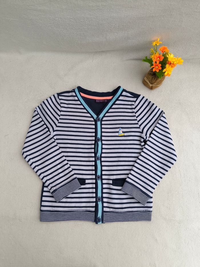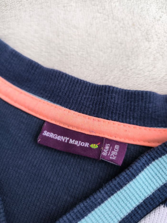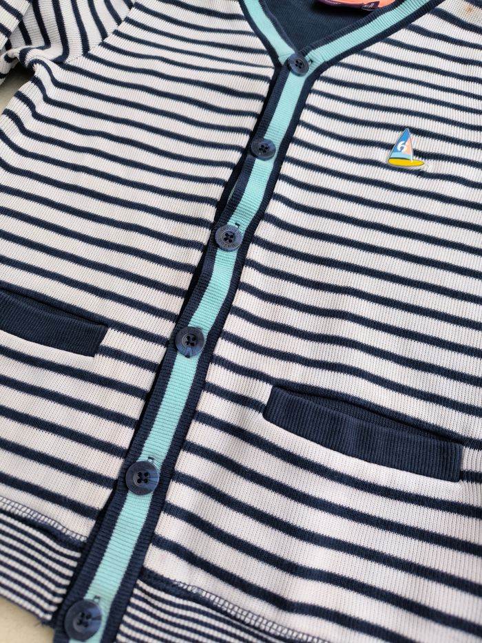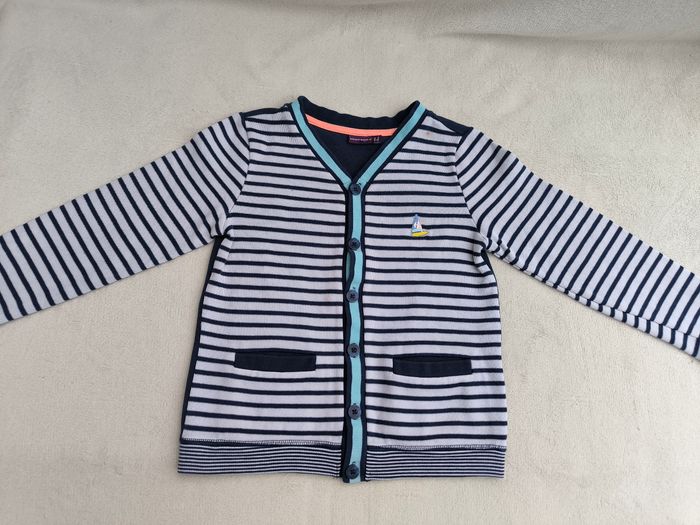 Gilet à manches longues Marque Sergent Major Taille 8 ans, 128 cm • Coloris blanc, marine, bleu, • Pin's bateau/voile, rayures horizontales, inscription "voilier" au dos • Fermeture par boutons • 2 poches • Coton fin • Petite tache sur le haut Peu porté, en très bon état #evelyne_garcons_8ans #evelyne_garcons
