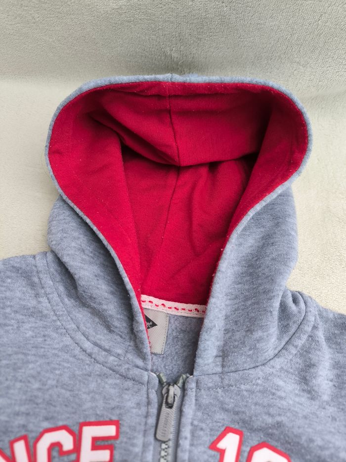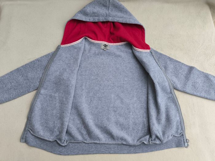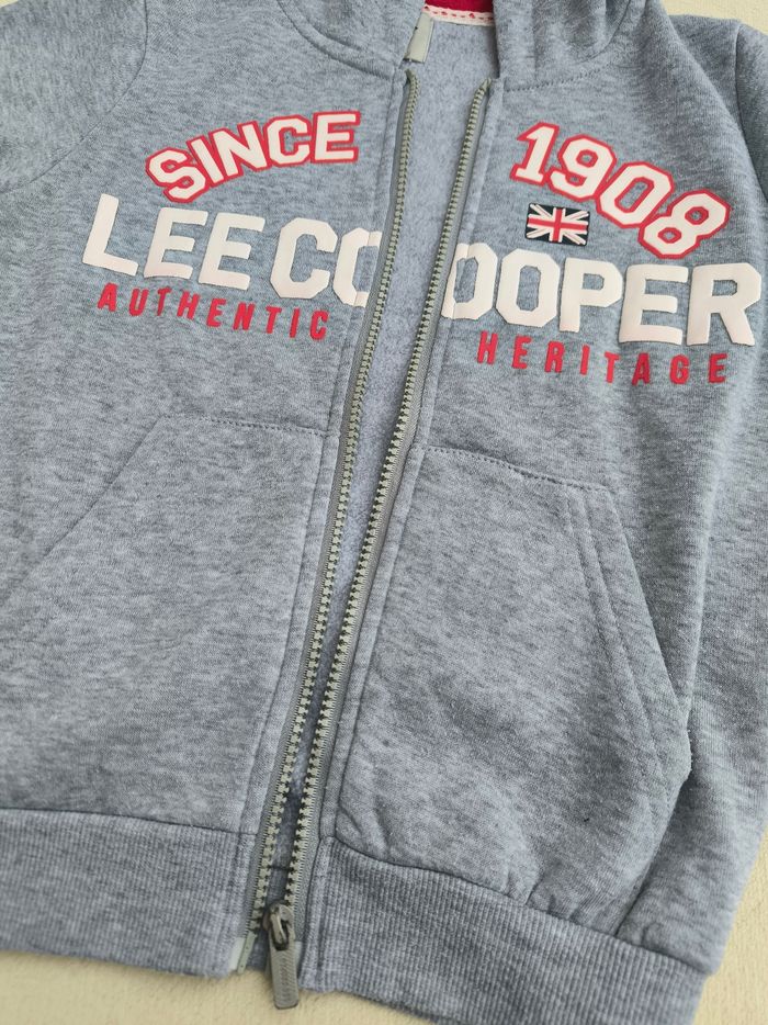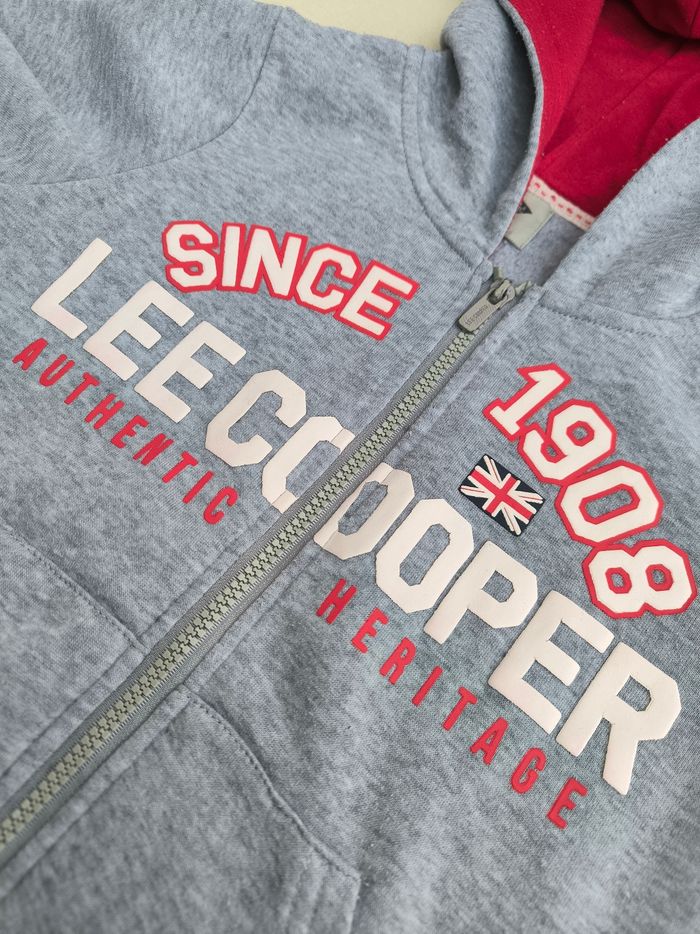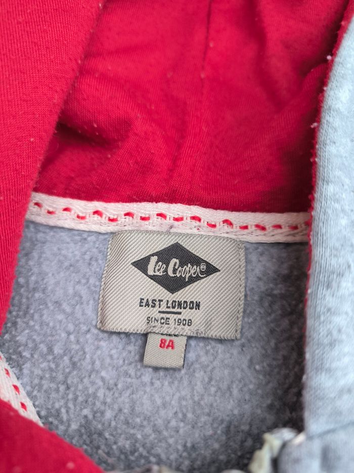 Gilet à capuche et à manches longues Marque Lee Cooper Taille 8 ans • Coloris gris, rouge, blanc • Inscription "Since 1908 Lee Cooper Authentic Heritage" • Fermeture par fermeture éclair • 2 poches • Intérieur molletonné • Bouloché, coloris blanc légèrement déteint, peinture fermoir écaillé En bon état #evelyne_garcons_8ans #evelyne_garcons