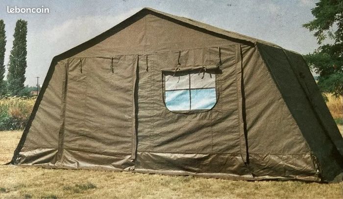 Grande tente militaire occasion en provenance de l' armée Française Dimensions 4m18 x 5m60 Hauteur en haut des murs 2m15 Hauteur au faîtage 3m Armature en tubes diamètre 4cms Idéale pour logement de groupes,repas etc
