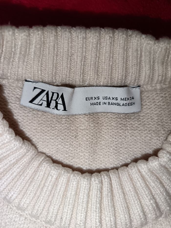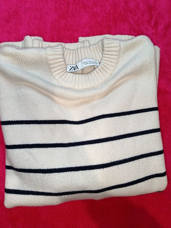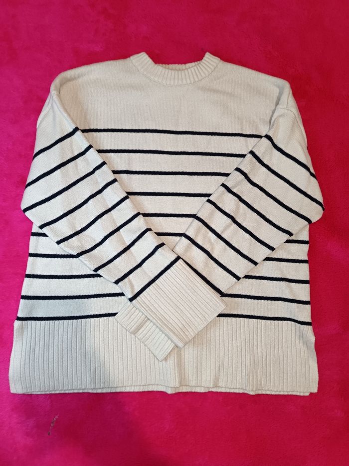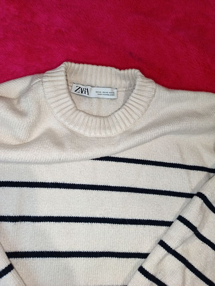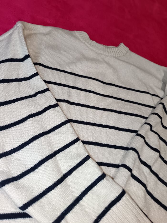 Pull Zara blanc à fines rayures noires style marinière. Coupe élégante avec un col rond et des finitions larges en bords-côtes aux poignets et à la taille. Textile souple et agréable 🧶 Mesures: Épaules: 40cm. | Longueur: 60cm | Longueur bras: 50cm 📦 Envoi soigné sous protection adaptée 🚀 Envoi ultra-rapide sous 24h à 48h maximum