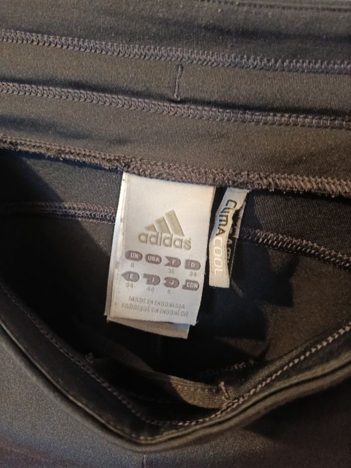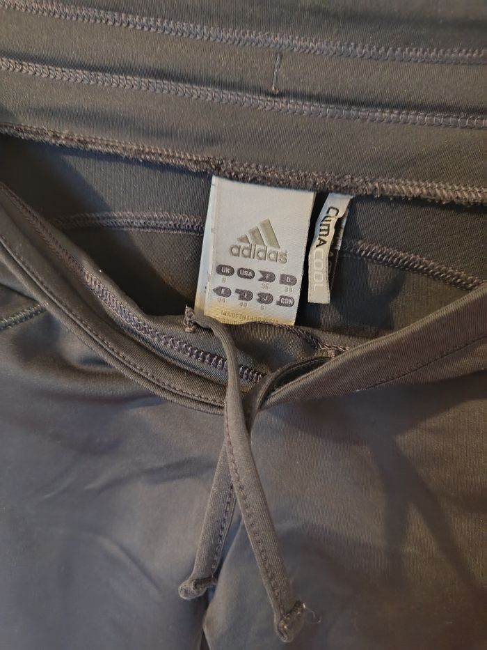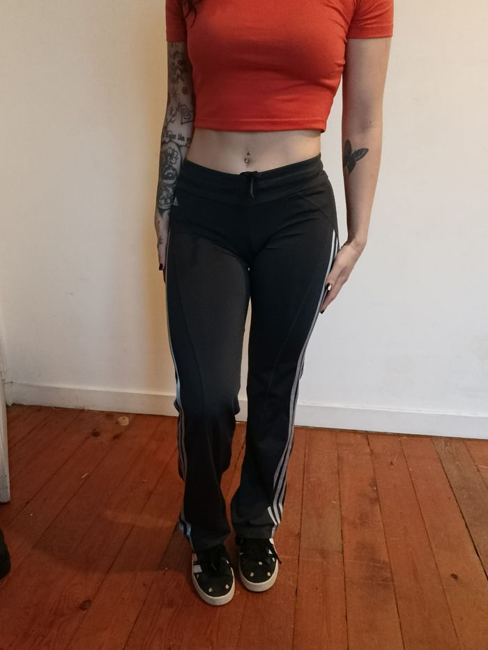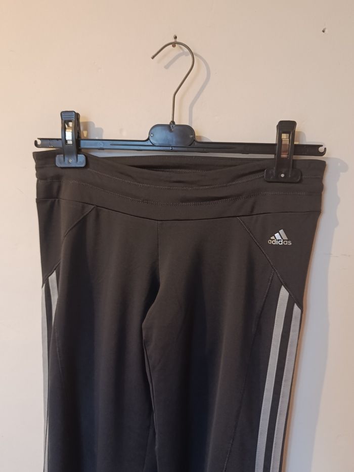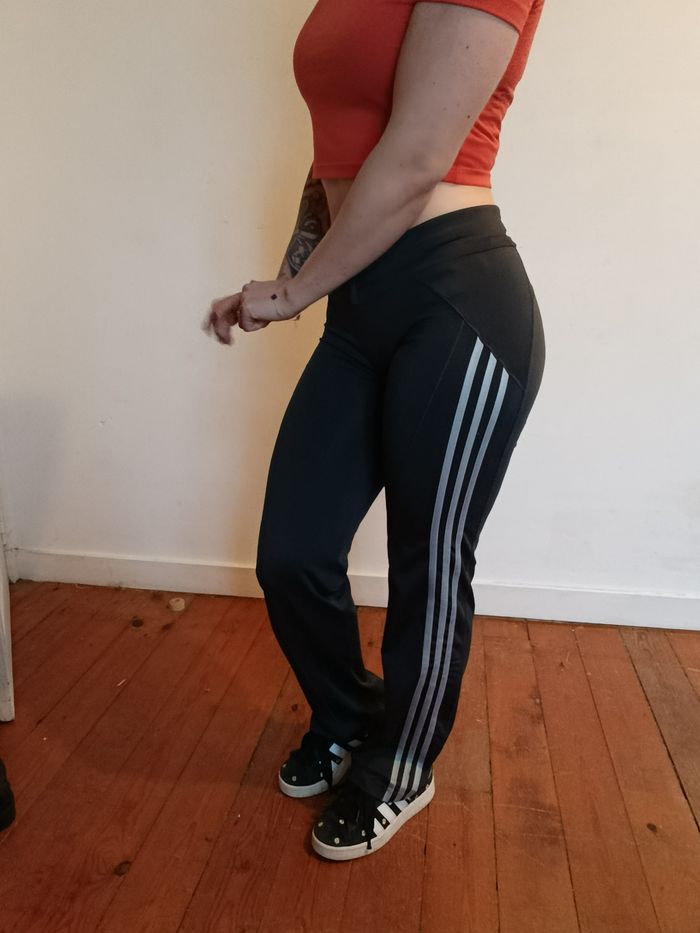 Pantalon legging évasé sport Adidas Climacool ⭐ Noir avec bandes grises iconiques, coupe droite légèrement flare. Taille élastique avec cordon de serrage, matière stretch confortable. 📏 Taille : S (UK 8 / EU 36) 🧵 Matière : polyester technique respirant ✨ État : très bon état J'accepte les offres et réductions en lot 🤍 N'hésitez pas à me suivre je poste des nouveautés tout les jours ⭐