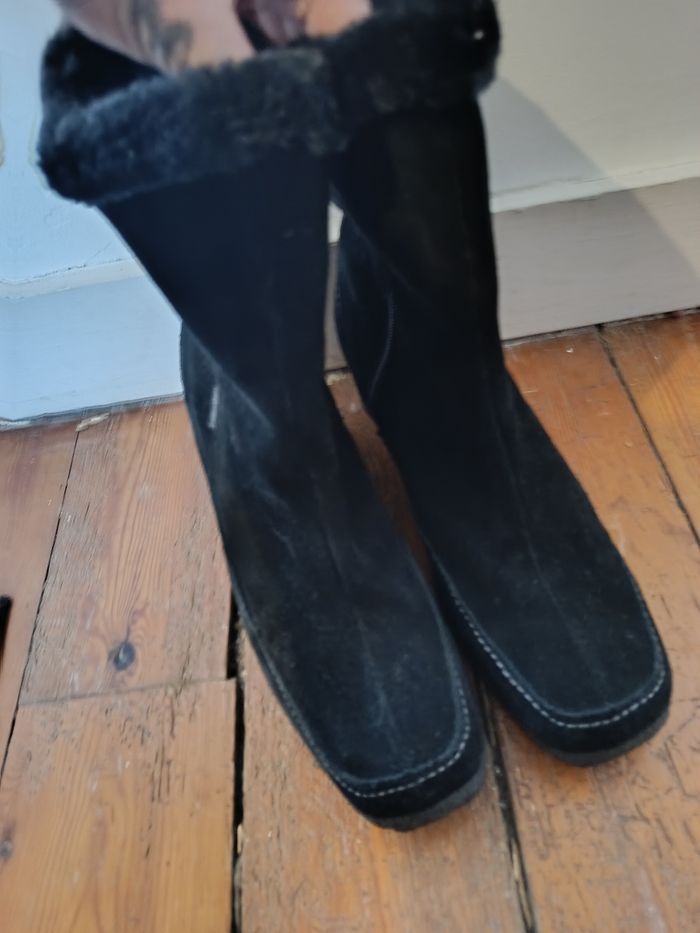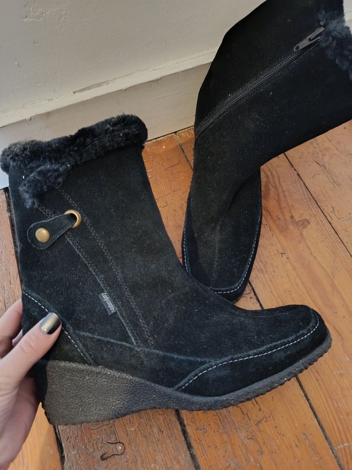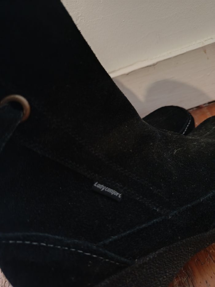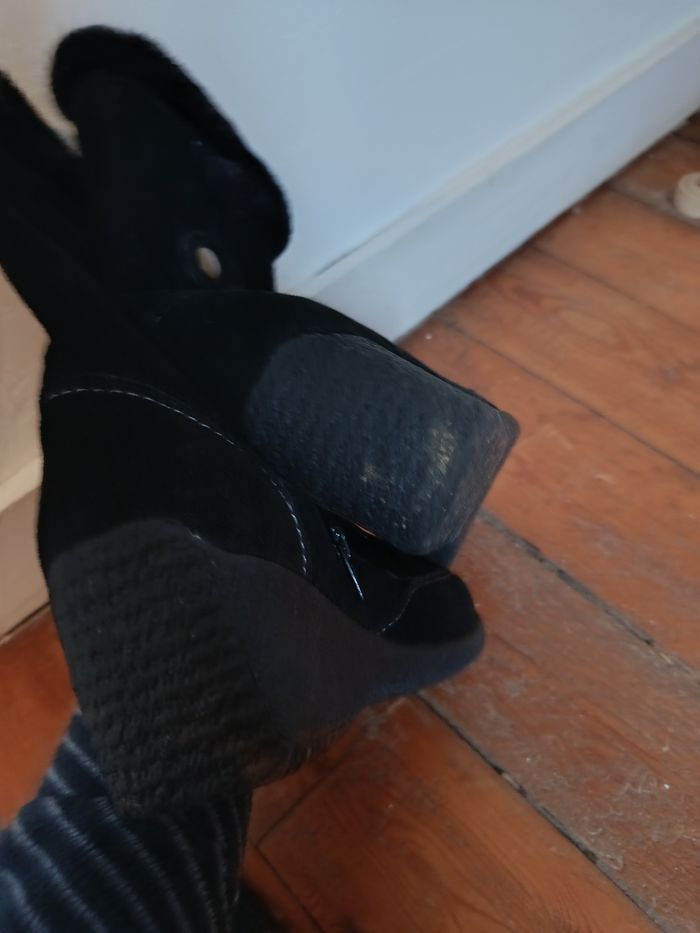 Bottines noires en suédine, talon compensé confortable. Intérieur doublé chaud, zip sur le côté. Très bon état général (légères traces d’usure visibles sur les photos). Taille 38. J'accepte les offres et réductions en lot 🤍