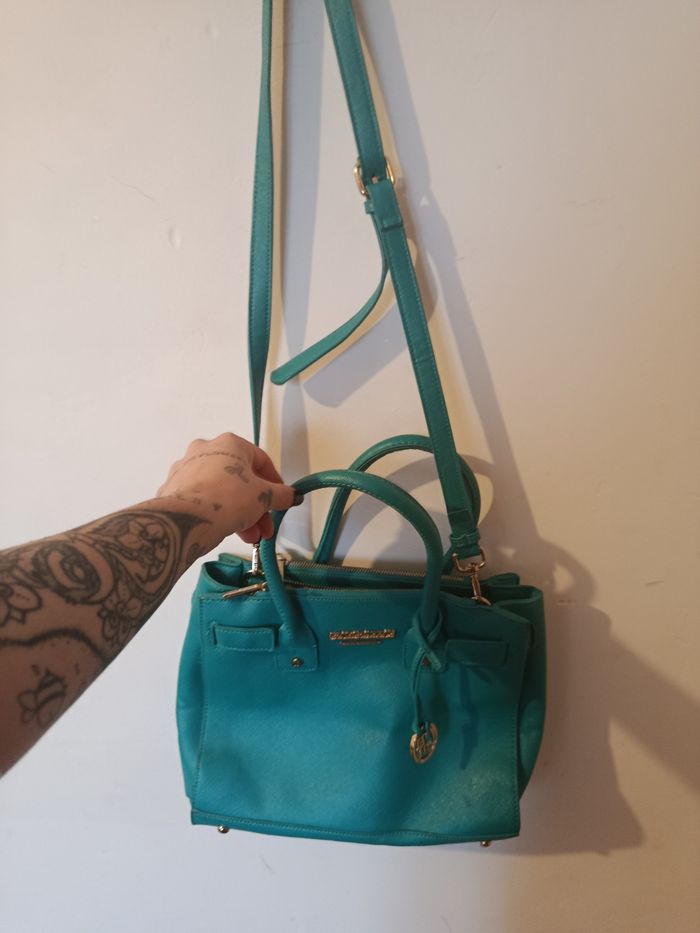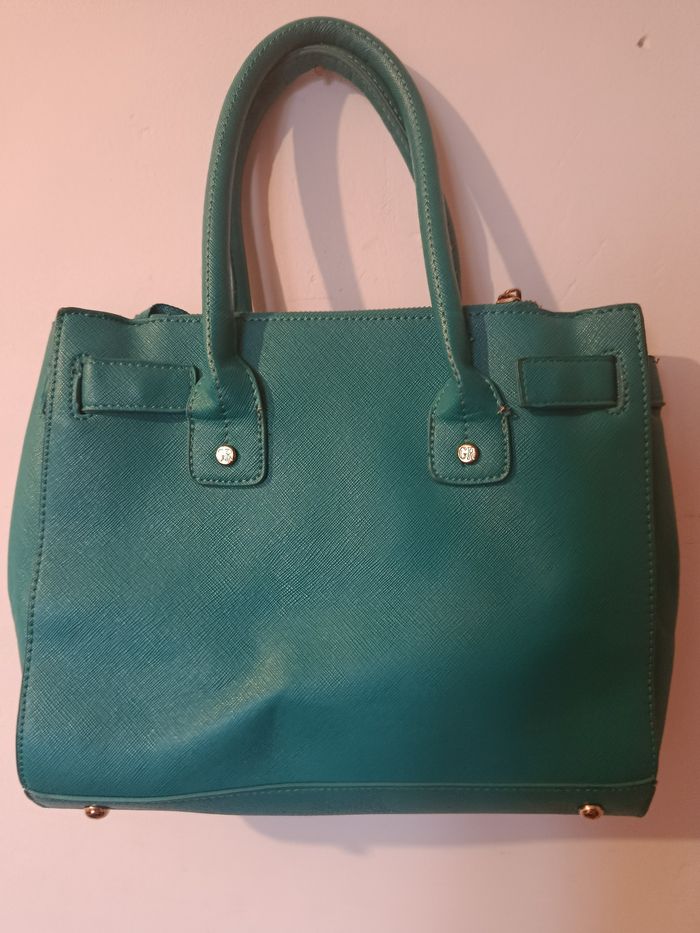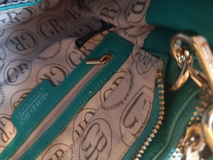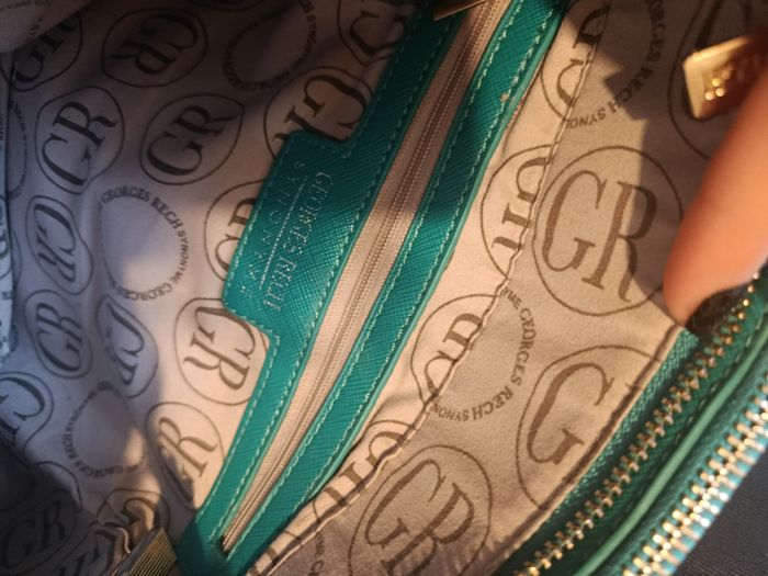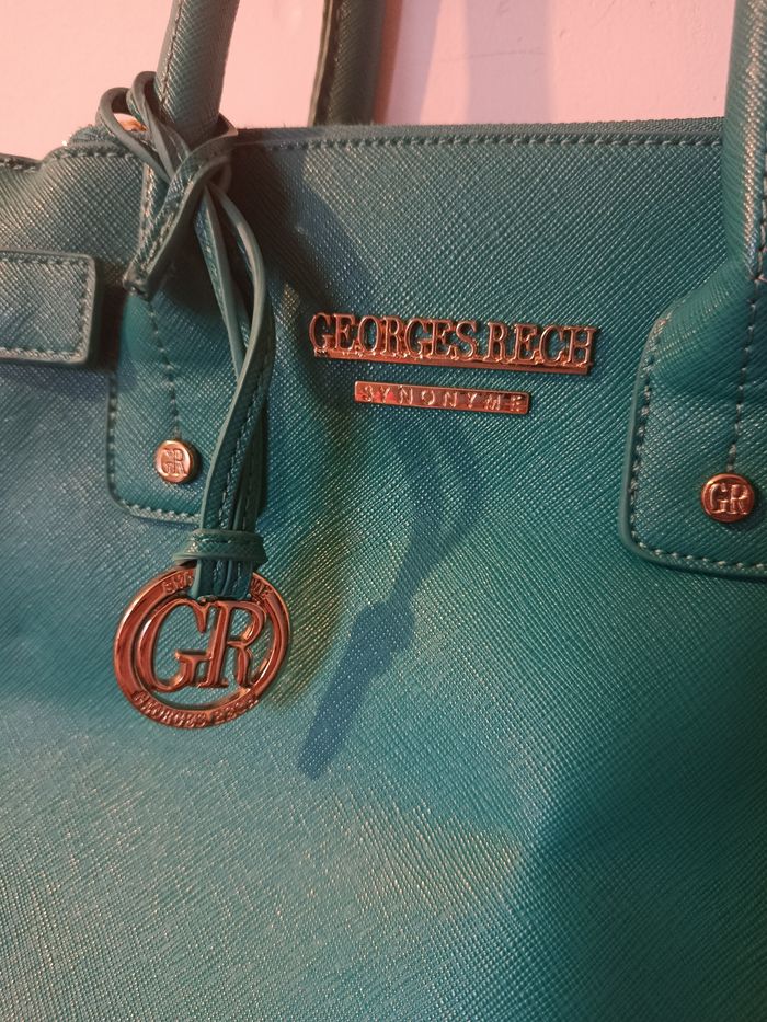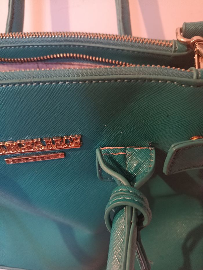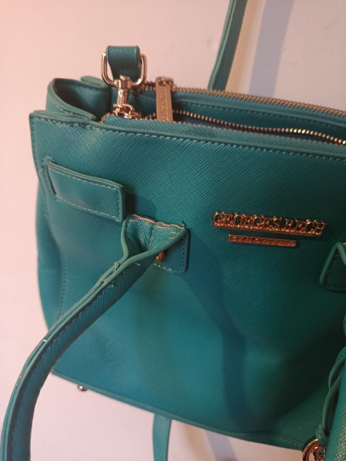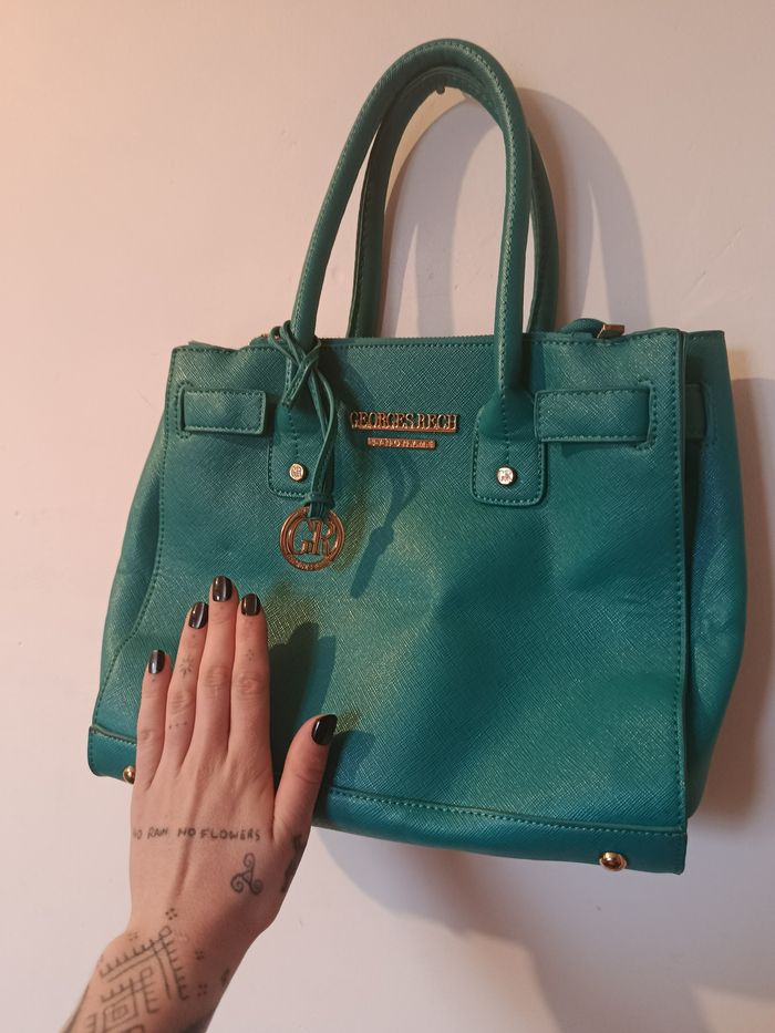 Sac à main Georges Rech, couleur vert bleu ultra élégante. Format structuré, porté main ou épaule (bandoulière réglable). Détails dorés, logo signature, intérieur doublé avec poche zippée. ⚠️ À noter : léger craquelage du simili cuir à l’arrière des poignées, dû à l’usage (voir photos). N’altère ni l’esthétique globale ni l’utilisation. ✨ Bon état général J'accepte les offres et réductions en lot 🤍