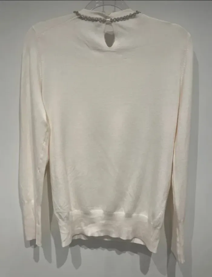 Top en maille douce à manches longues, col bijou, coupe droite, de couleur crème. Largeur entre les épaules 38, entre les aisselles 47cm, longueur 63 cm.