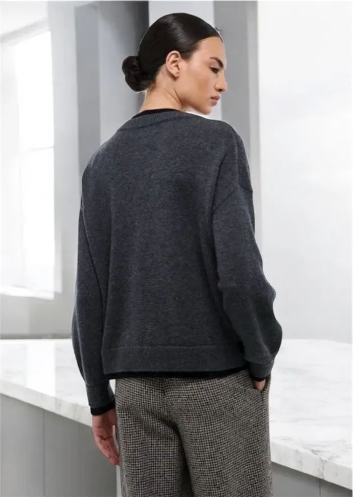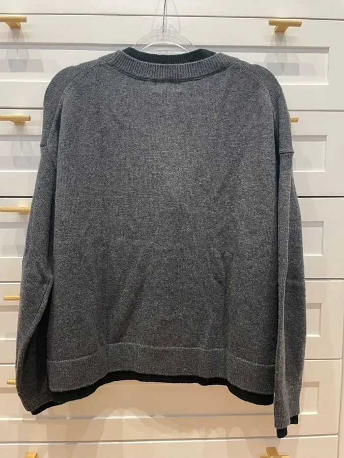 Cardigan ample à effet superposé en trompe-l'œil, contenant de la laine et du cachemire. Composition: 75 % laine, 20 % polyamide, 5 % cachemire. Porté 1 fois seulement. En parfait état. Largeur entre les aisselles 57cm, longueur 63cm.
