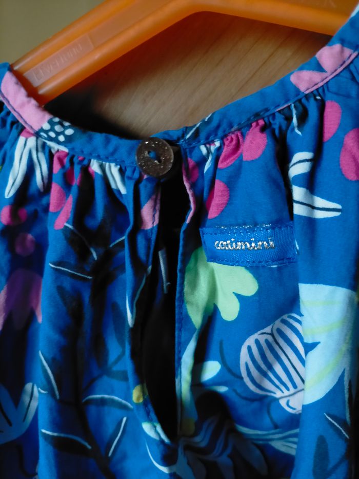 Excellent état, à peine porté. Ravissante robe à petites manches et coupe évasée en cotonnade bleu imprimé fleuri multicolore. Un bouton et étiquette catimini au dos