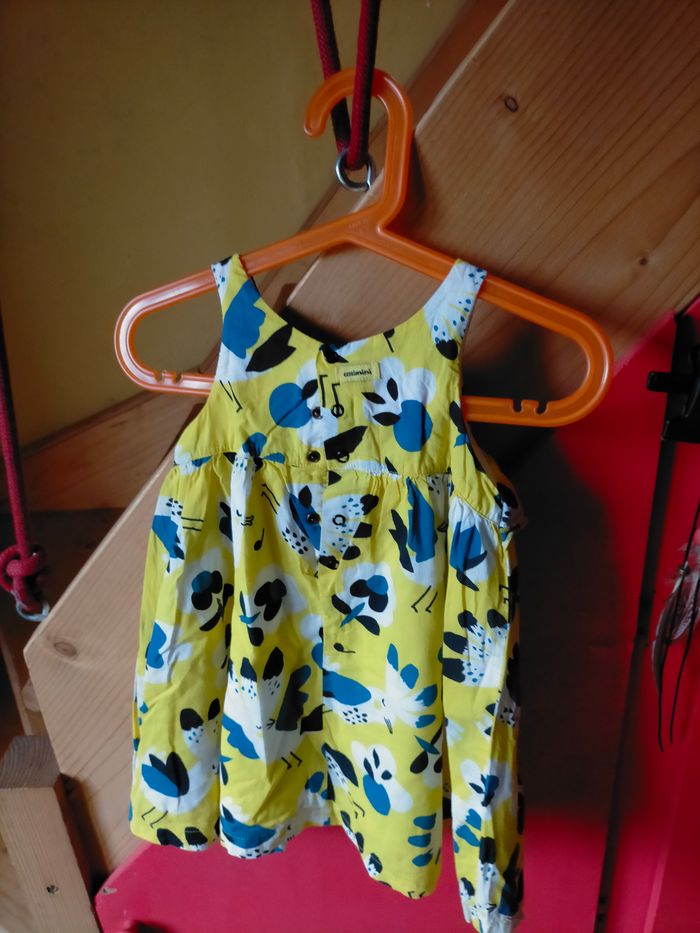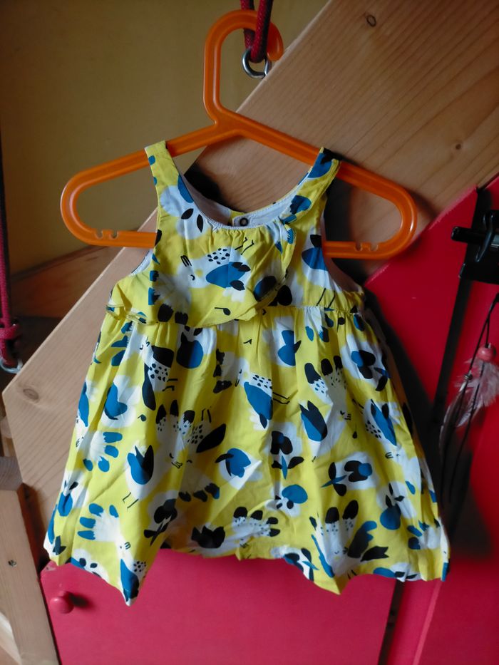 Excellent état. Très jolie robe sans manche en cotonnade jaune imprimé bleu, noir et blanc. Pressions et étiquette catimini au dos