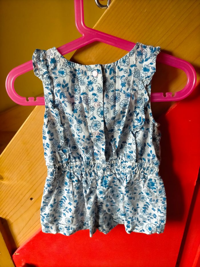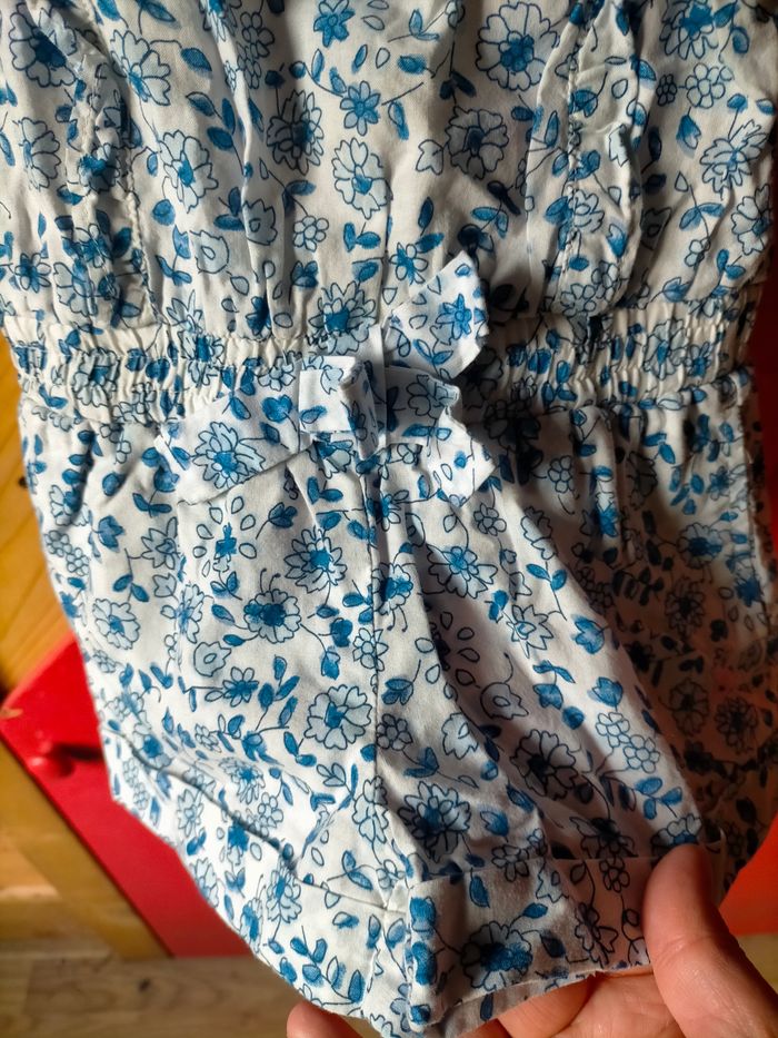 TBE Très jolie combinaison short en cotonnade blanche fleurie bleu. Volant aux emmanchures, taille élastique avec nœud devant et boutons au dos