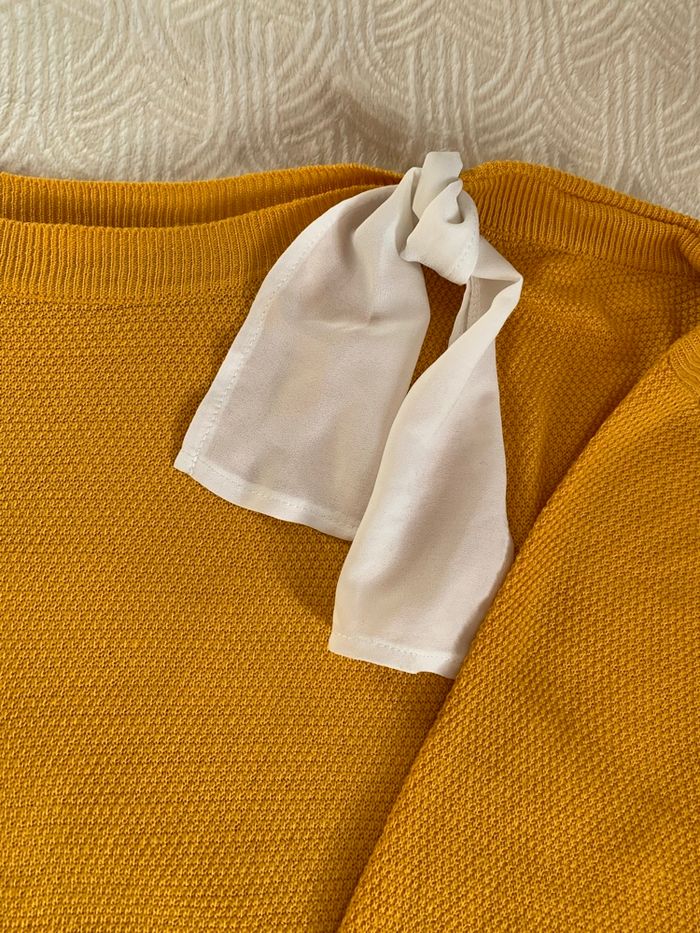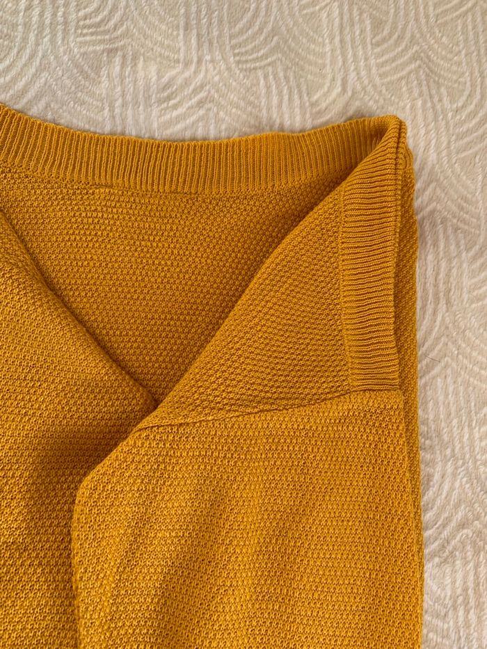 Pull cache cache fin, noeud au niveau du col, couleur jaune épices.