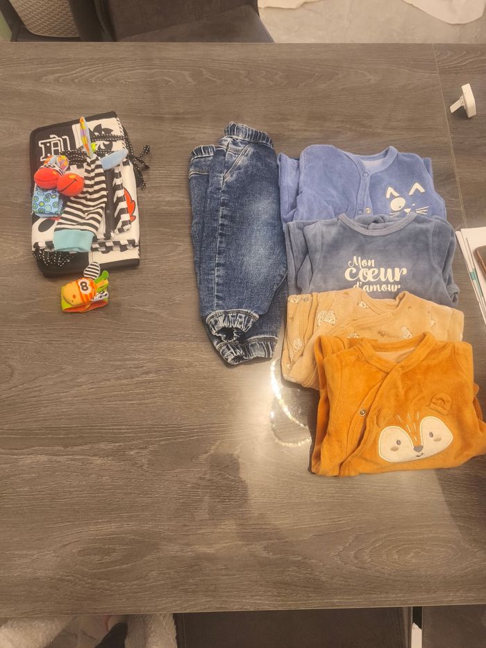 Bonjour je vends 2 gigoteuse une combi pilote 4 pyjama en jean et quelques jouets pour bébé garçon les pyjamas sont du 3 mois ainsi que le jean la combinaison c'est plutôt du 6 mois. N'hésitez pas à me contacter si vous avez besoin.