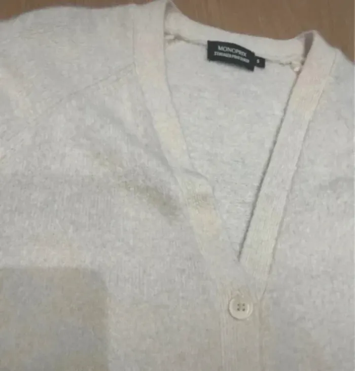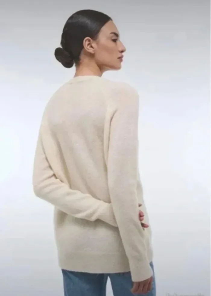Composition produit: 49% Polyamide, 20% Acrylique, 18% Laine, 10% Alpaga, 3% Elasthane (étiquette de composition enlevée). Couleur: écru.