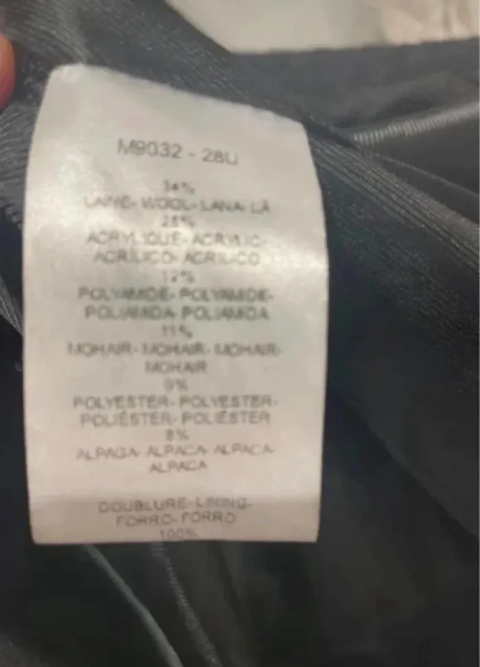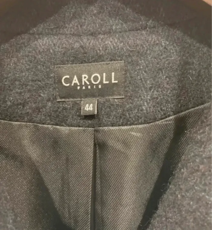 Manteau contenant de la laine, du mohair et de l'alpaga, coloris bleu foncé, présentant un mélange subtil de fils bleus et noirs. Fermeture croisée. Pièce en parfait état, très peu portée. Composition : 34 % laine, 25 % acrylique, 12 % polyamide, 11 % mohair, 9 % polyester, 8 % alpaga. Mesures: longueur 102 cm, largeur entre aisselles 60 cm.