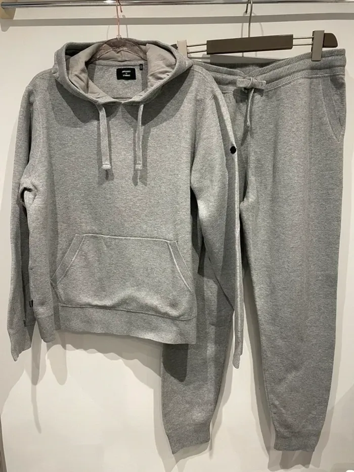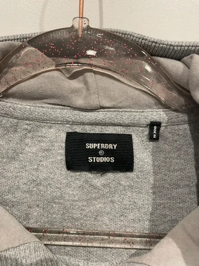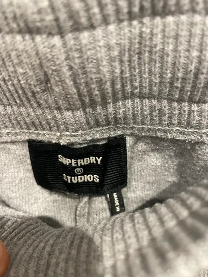 Ensemble pull à capuche et pantalon gris Superdry Studios. 100% coton (étiquettes composition enlevées). Pantalon : largeur taille 43cm sans serrer, longueur 103cm. Hoodie: largeur entre les aisselles 53cm, longueur 65cm.