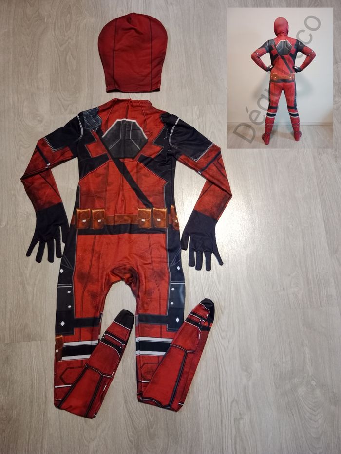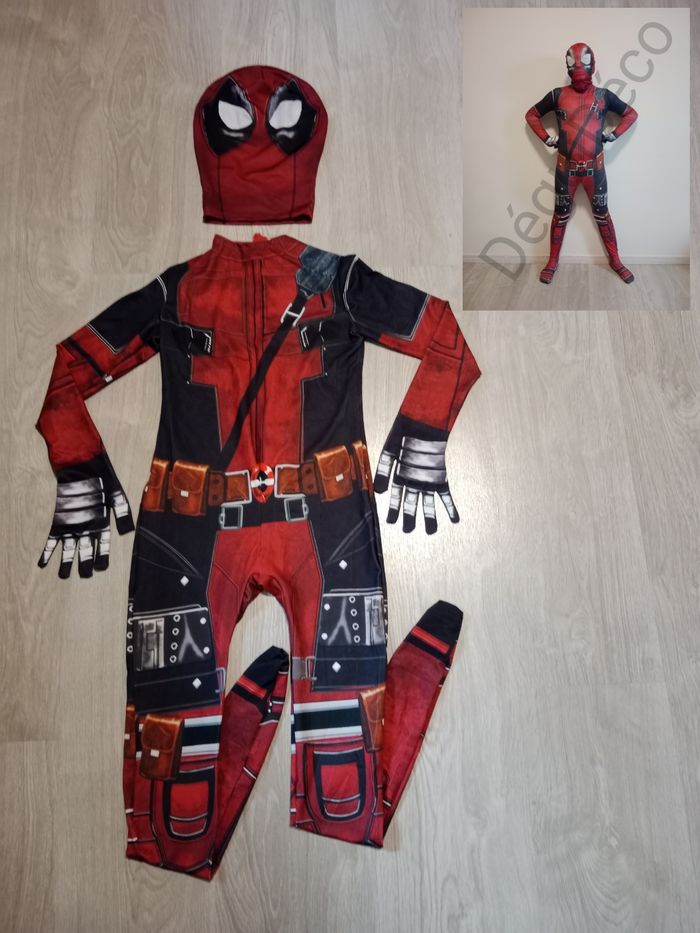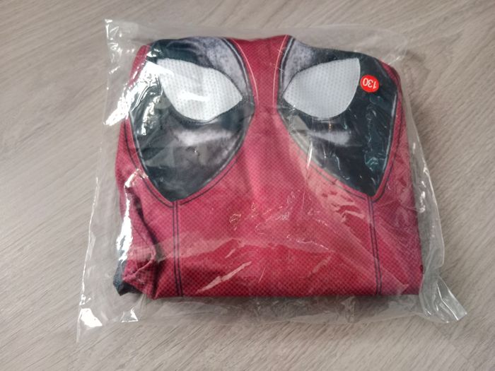 Déguisement inspiré de Deadpool Taille 130 (8 ans) Combinaison complète avec pieds et gants intégrés + cagoule Fermeture dans le dos et braguette sur le devant. #carnaval