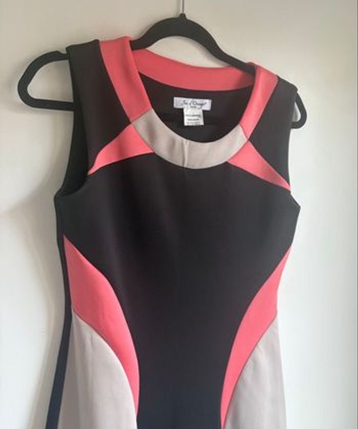 Robe sans manches de la marque Jus d’Orange Paris. Coupe structurée et flatteuse, motifs graphiques noir, rose et beige. Matière légèrement stretch, confortable à porter. Très bon état, aucun défaut. Fabrication Made in France. Taille : convient pour un 38 / 40. Composition : 95 % polyester, 5 % élasthanne. Lavable à la main (selon étiquette). Idéale pour le travail, une occasion ou le quotidien. #robe #jusdorange #robefemme #robegraphique #madeinfrance #taille38 #taille40 #tresbonetat #robechic #robeelegante