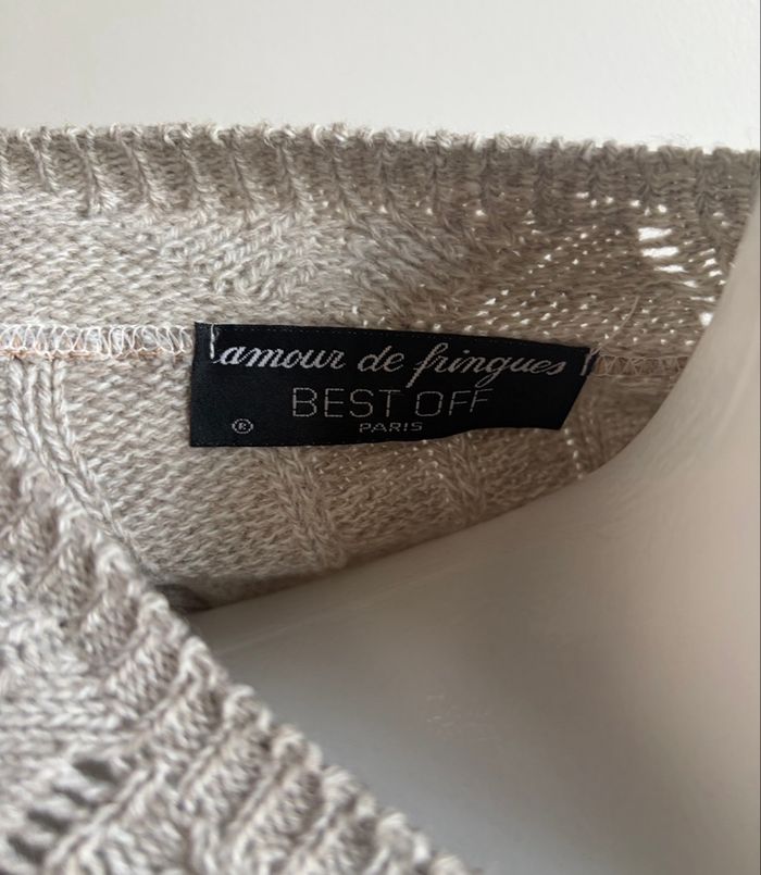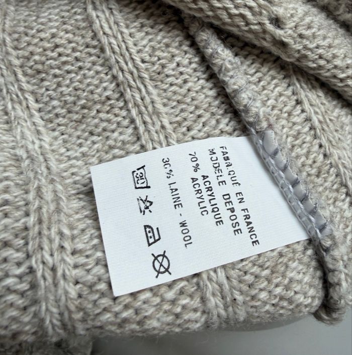 Pull en maille côtelée beige, col V croisé. Marque : Lamour de fringues – Best Off Paris. Taille unique, correspond selon moi à un 38/40. Composition : 30 % laine, 70 % acrylique. Fabrication indiquée : France (modèle déposé). Coupe confortable, maille souple et agréable à porter. Très bon état, peu porté, aucun défaut à signaler.