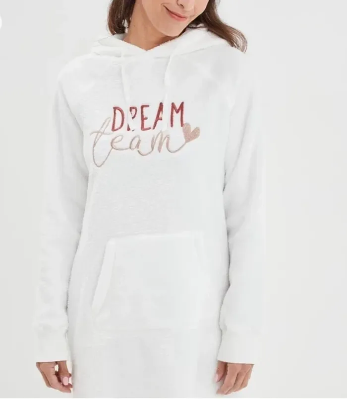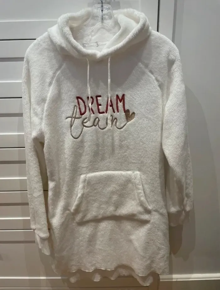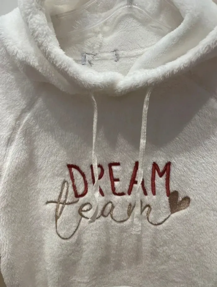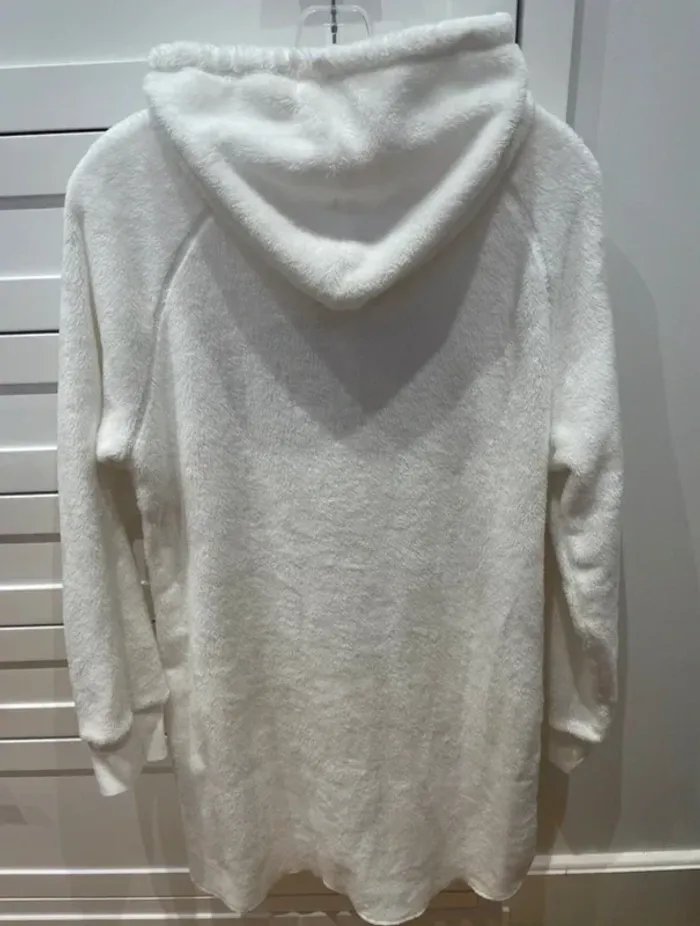 Poncho effet peluche avec capuche blanc. Tissu principal: 100% Polyester Porté 1 fois seulement, étiquettes enlevées car gênait . Aucun défaut. Largeur entre aisselles 50cm, longueur derrière 90cm, longueur devant 84cm. Prix définitif.