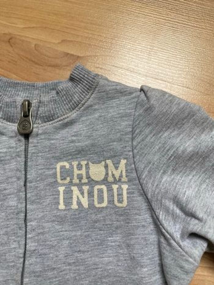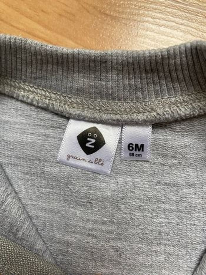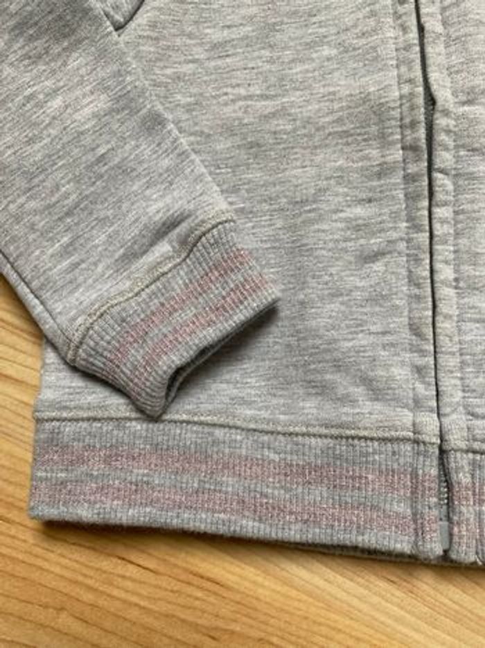 Gilet zippé « Grain de blé » 6 mois (68cm) gris chiné avec 2 petites bandes rose chiné aux poignets et bas du gilet, petite inscription sur 1 des devants