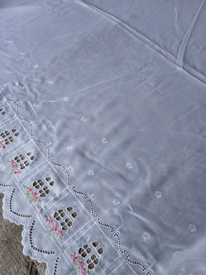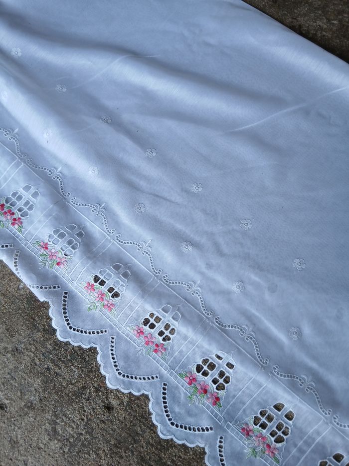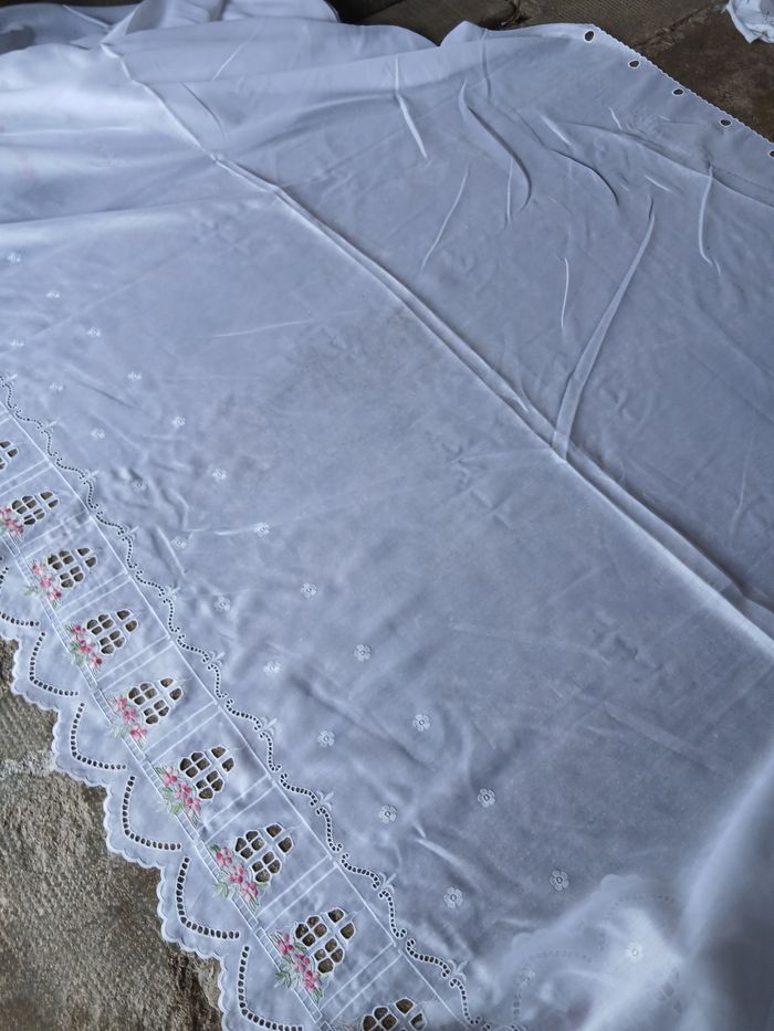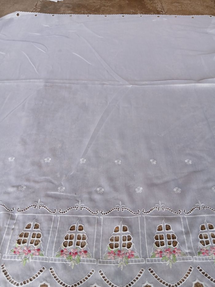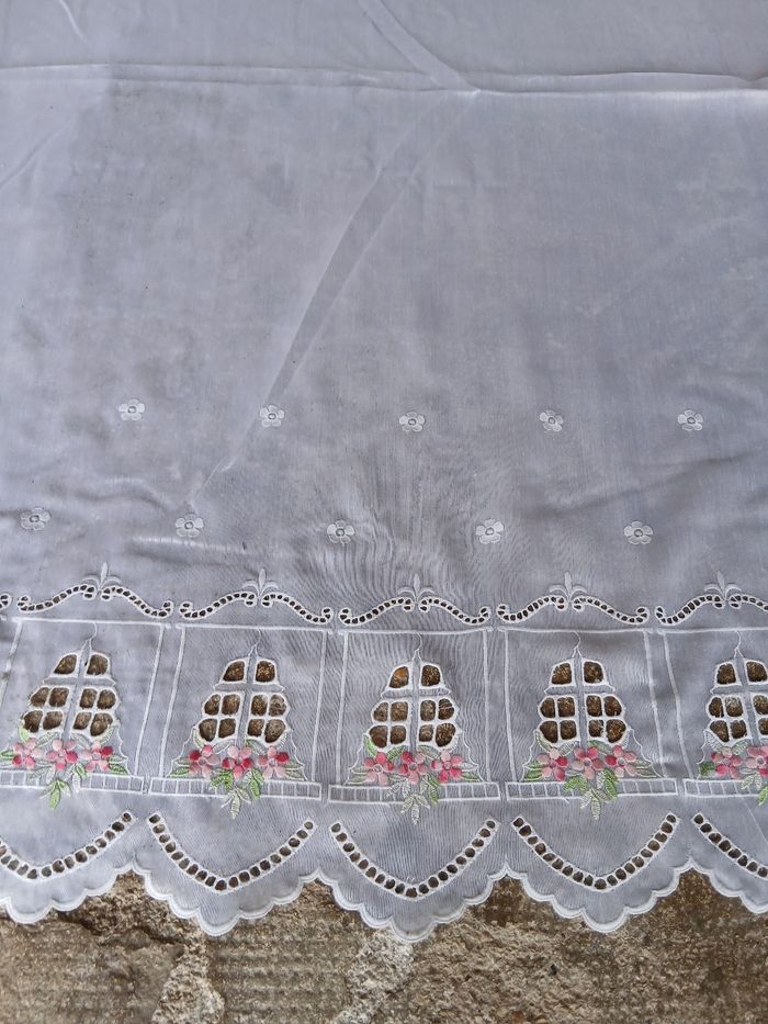 Brise bise sur un boule sablé perlé et brodé fenêtres avec fleurs couleurs. Et passage pour lettre une barre. En 1m20 de hauteur sur 4m de longueur possibilité de plus de métrages. Fabrication française