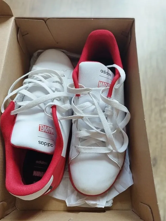 Adidas modèle Advantage - édition limitée Spiderman, pointure 36 2/3. Peu portées (5 fois max), très bon état, juste une petite trace noire sur le bout d'une des chaussures (voir photo). Vendues dans leur boite d'origine. #adidassneakers #adidas #adidasoriginals #spiderman #marvel #kids #adidasadvantage #limitededition