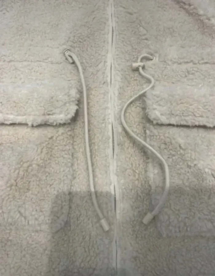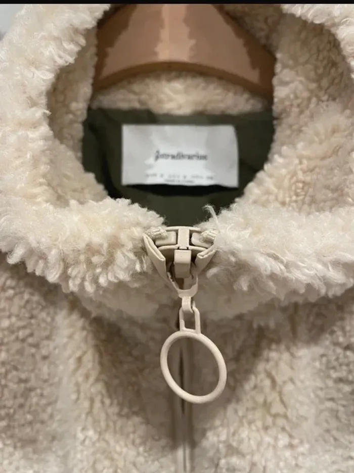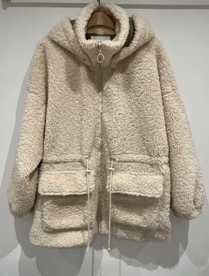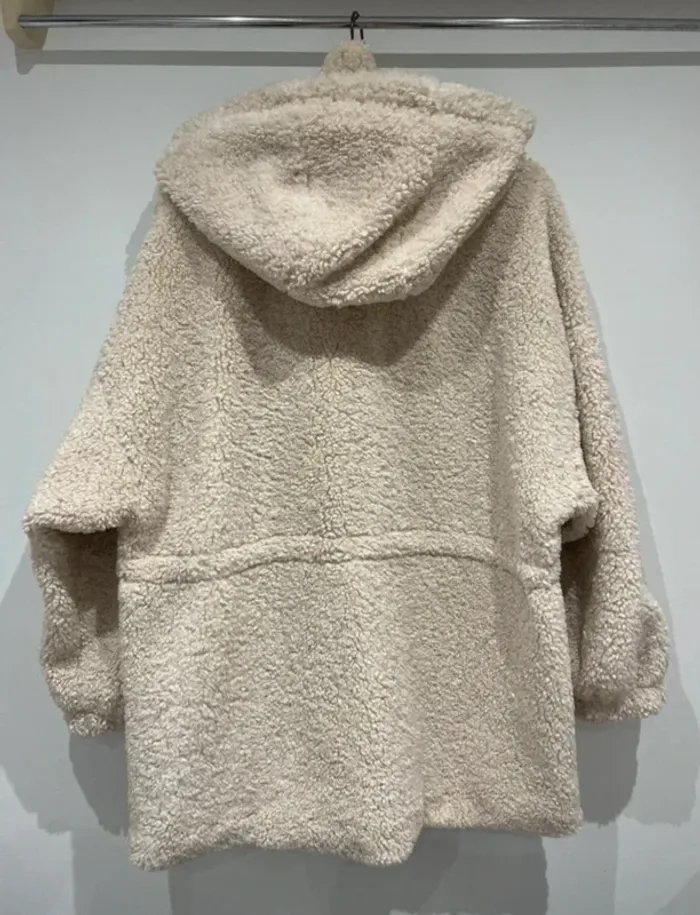 Manteau midi confectionné en tissu à effet mouton synthétique au toucher doux. Coupe droite. Style ample. Capuche détachable. Porté 1 fois, comme neuf. Mensurations: largeur entre les épaules 67cm, longueur 74 cm. Etiquette de composition enlevée.