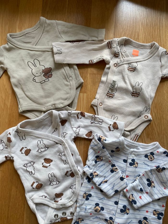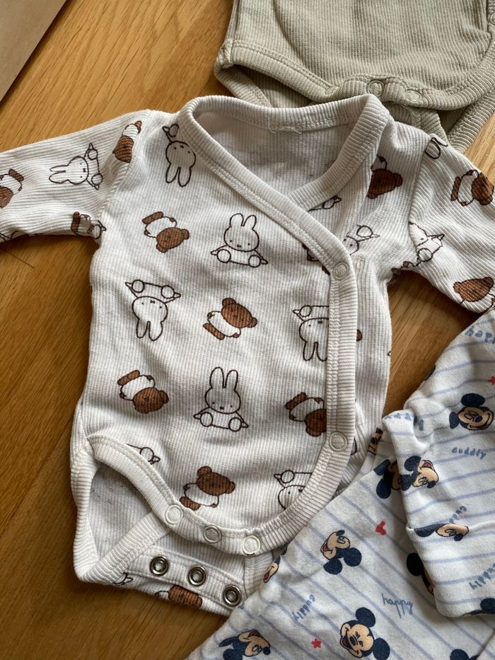 3 bodies Miffy évolutifs (2 rangs de boutons) + 1 pyjama Mickey. Taille naissance Comme neuf car porté 1 fois.