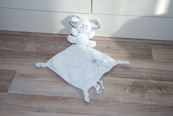 souris et son carré blanche, oreilles argent 3 fleurs argent brodées sur le carré tiamo collection faisait parti d'une collection, donc jamais toutouillé ni caliné état neuf 18X19 cm