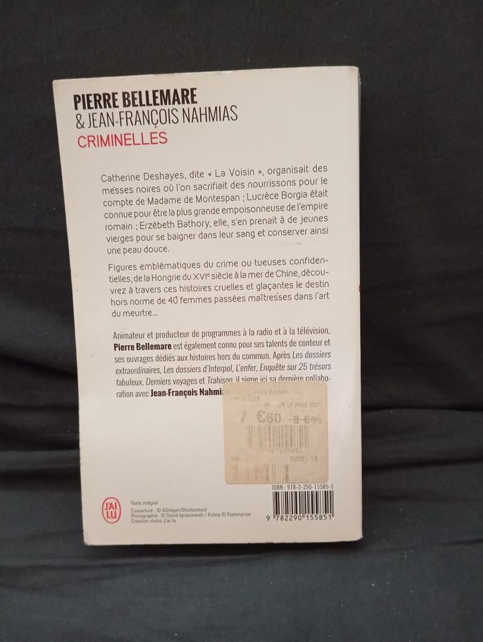 Je vends ce livre "Criminelles" de Pierre Bellemare et Jean-François Nahmias, un ouvrage sur l'histoire des femmes criminelles à travers les siècles. - Titre : Criminelles - Auteurs : Pierre Bellemare, Jean-François Nahmias - Éditeur : J'ai lu - Format : Broché - Langue : Français Bon état N'hésitez pas à me contacter pour plus d'informations !