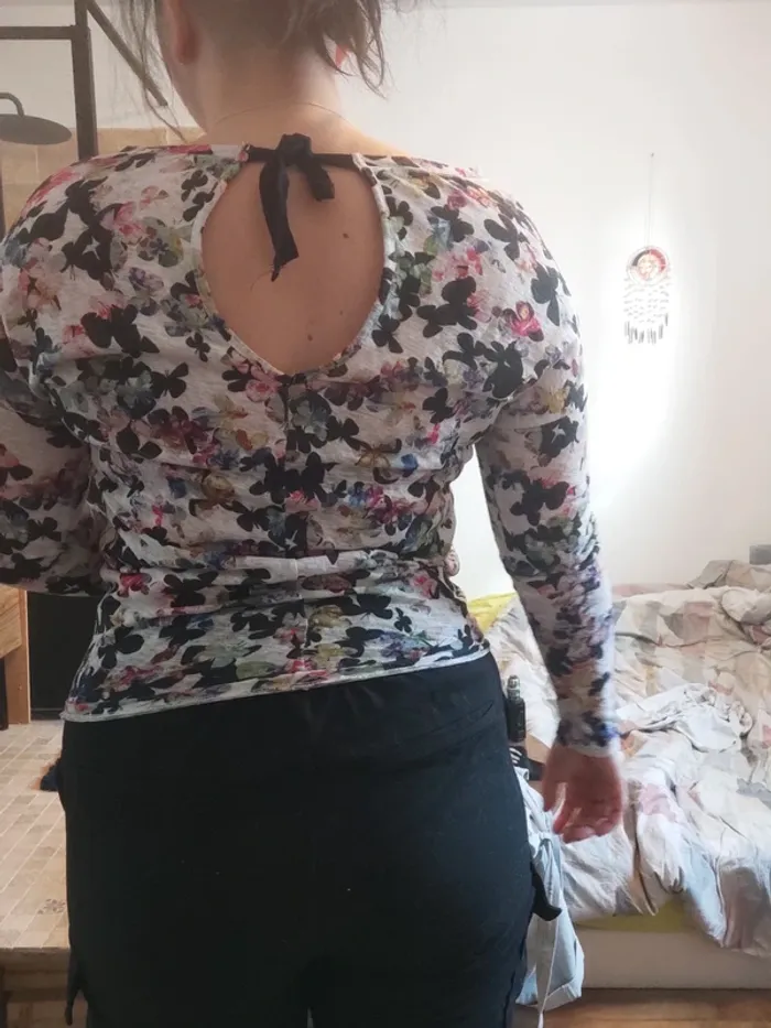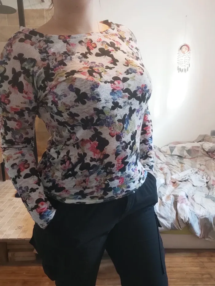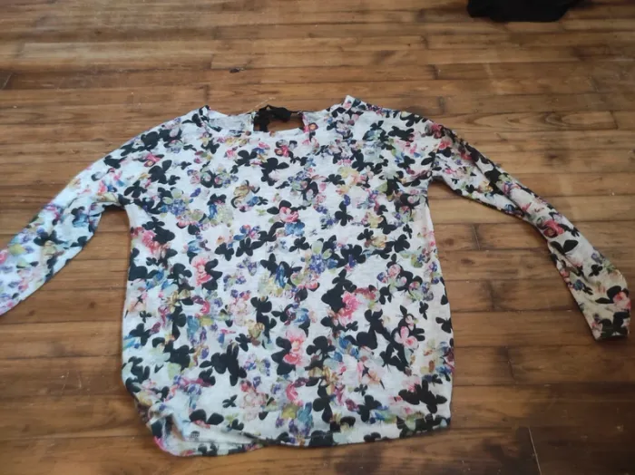 Haut manche longue motif papillons taille M Bershka. Petit accroc dans l'encolure voir dernière photo.