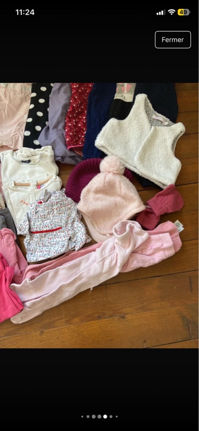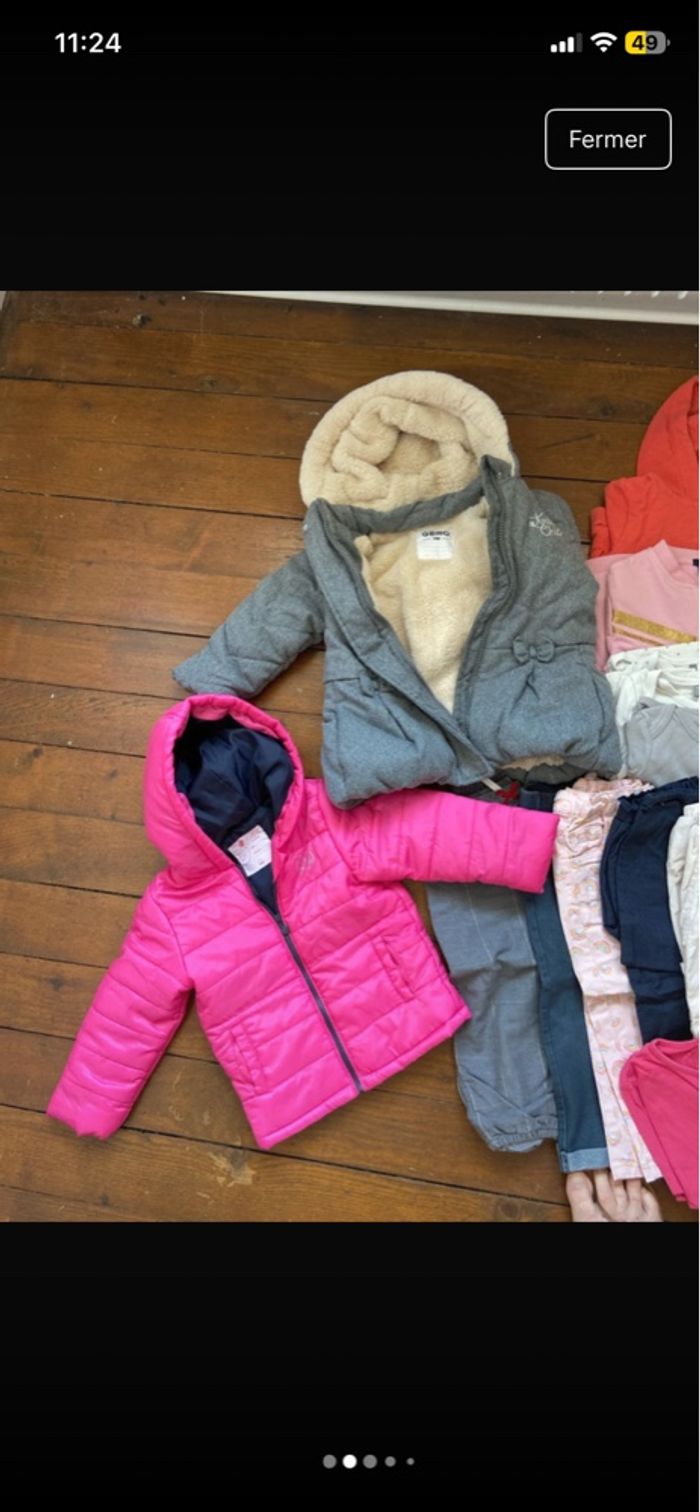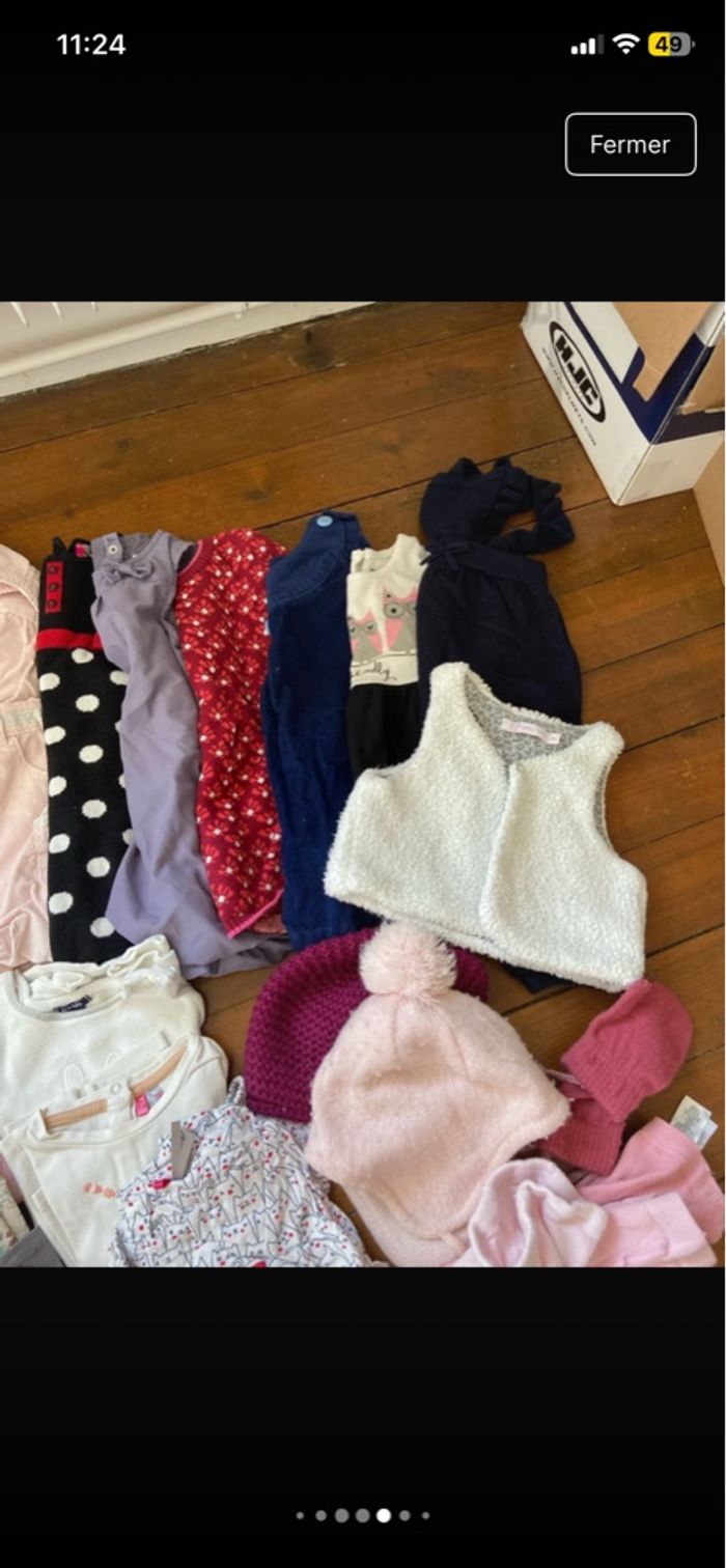 2 manteaux (hiver et mi-saison) 2 vestes 8 robes 5 pantalons 10 t-shirt ml dont 2 pull fin 1 gilet sans manche blanc 3 bodies dont 1 mc 3 collants 2 bonnets Moufles 1 combi mais elle bouloche voir photo