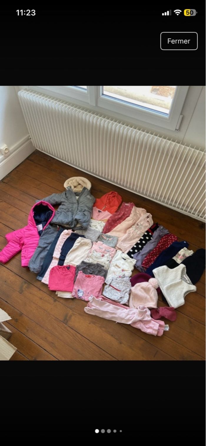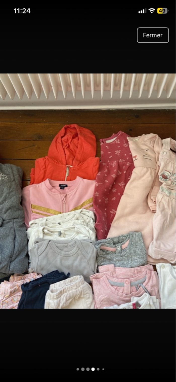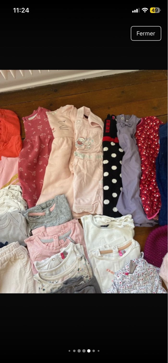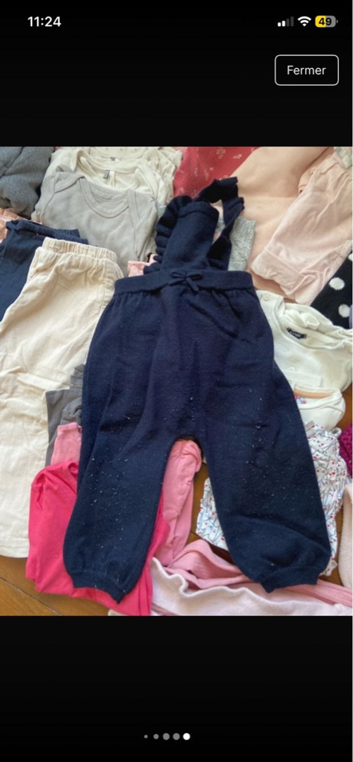 2 manteaux (hiver et mi-saison) 2 vestes 8 robes 5 pantalons 10 t-shirt ml dont 2 pull fin 1 gilet sans manche blanc 3 bodies dont 1 mc 3 collants 2 bonnets Moufles 1 combi mais elle bouloche voir photo