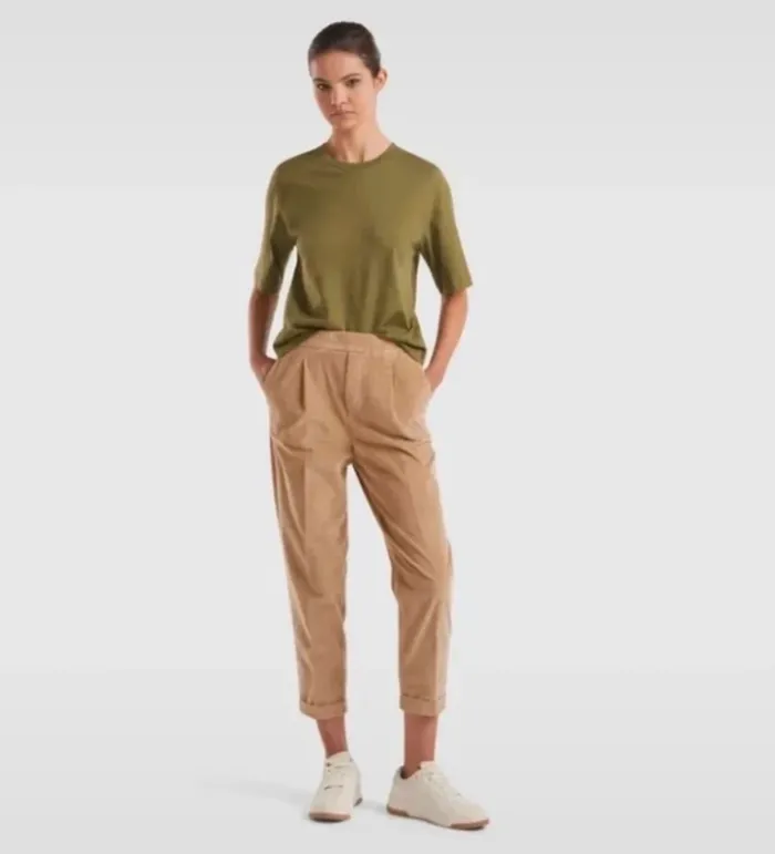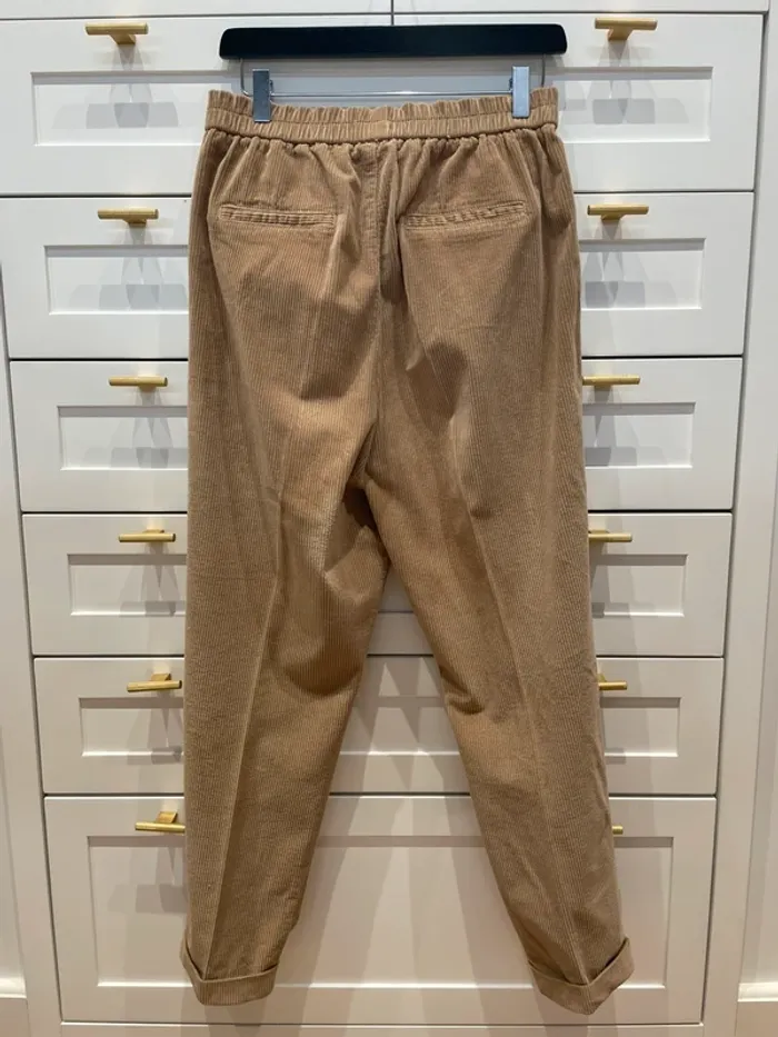 Pantalon chino en velours avec taille élastiquée. Revers cousu en bas de la jambe pour un look casual et décontracté. Coupe ample. Porté 1 fois seulement. Taille indiquée M, mais taille plus grand. Poches devant et fausses pochettes à l'arrière. Longueur à l'intérieur de la jambe 61,5 cm. Couleur : camel. 98% coton, 2% élasthane.