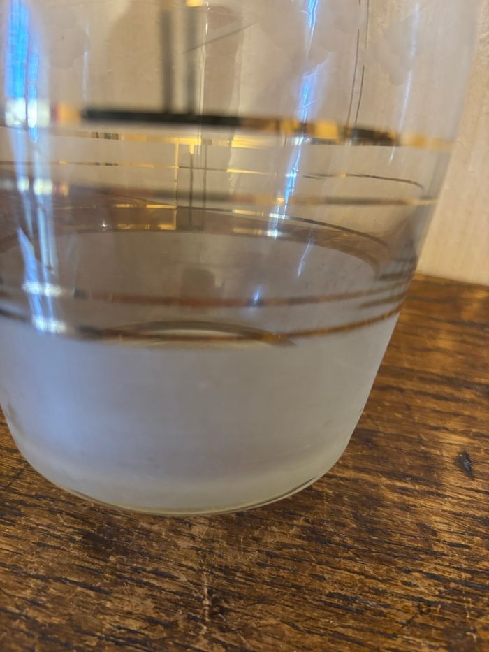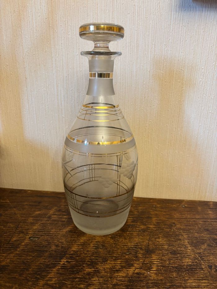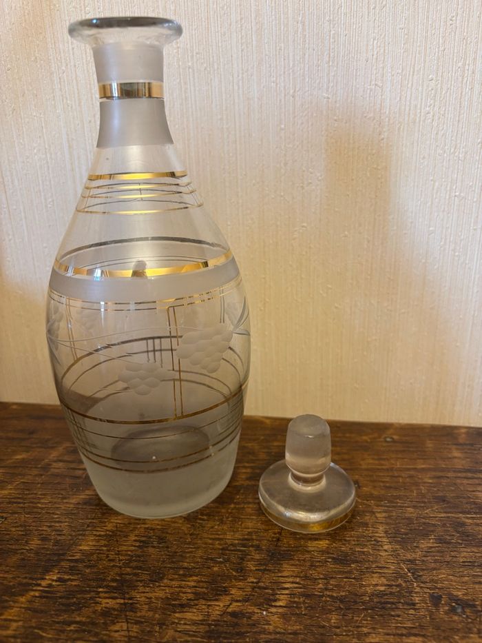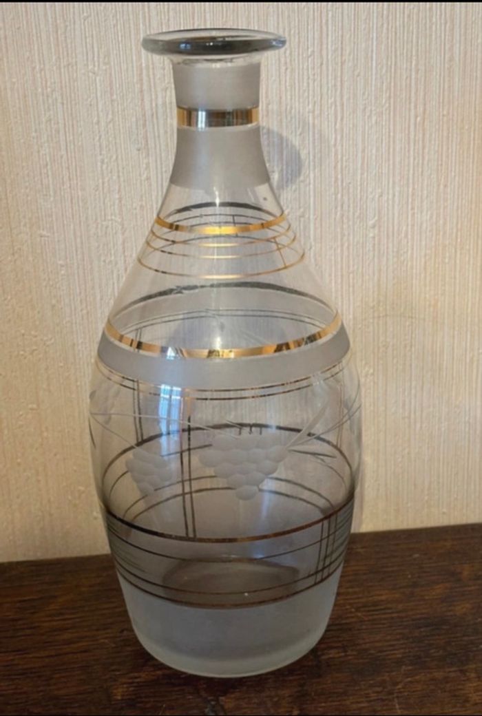 Vend carafon en verre ciselé avec traits or et parties opacifiées. Vintage (des années 50 probablement). Dimensions : Hauteur 23 cm (sans bouchon) Diamètre base 8 cm Diamètre au plus large 10 cm env Diamètre ouverture 2,5 cm env. À l’origine, c’était très certainement une carafe à liqueur. Il y avait un bouchon dessus mais était-ce celui d’origine, je l’ignore ? A été utilisée comme déco. Propre et sans fêlure ni ébréchure. Vendu 15€.