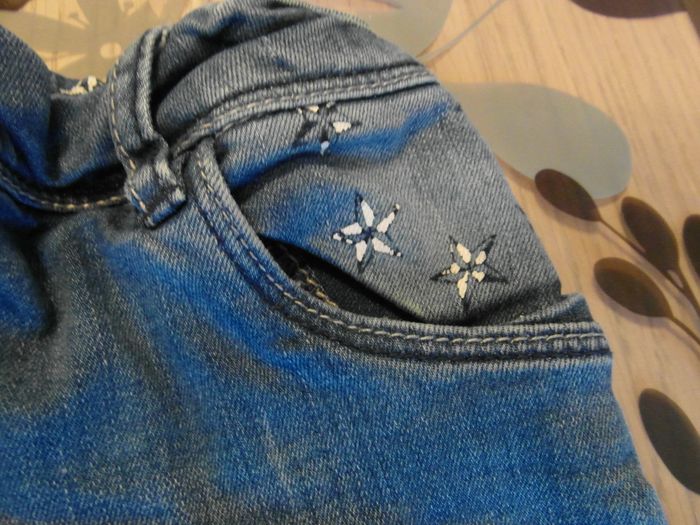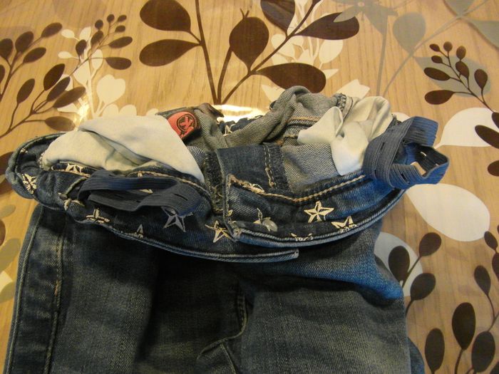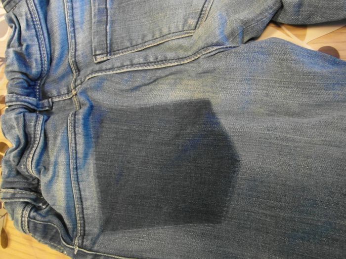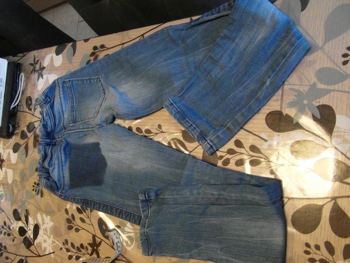 bleu très bon état longueur 91 cm 1 poche à l'arrière, la 2ème n'est pas arrachée, c'est un style élastiques ceinture bon état dessin sur poche avant gauche