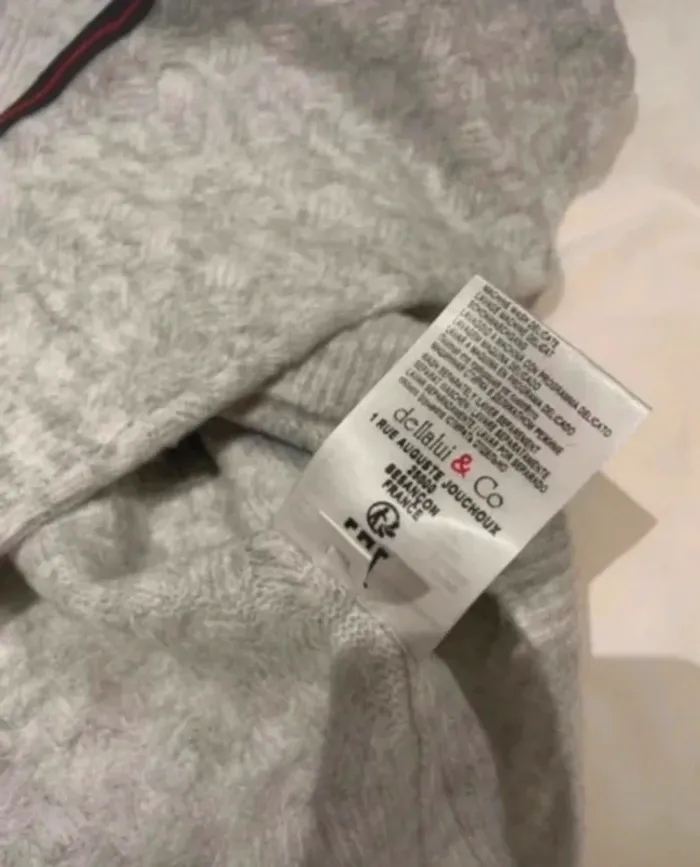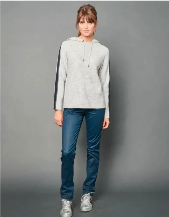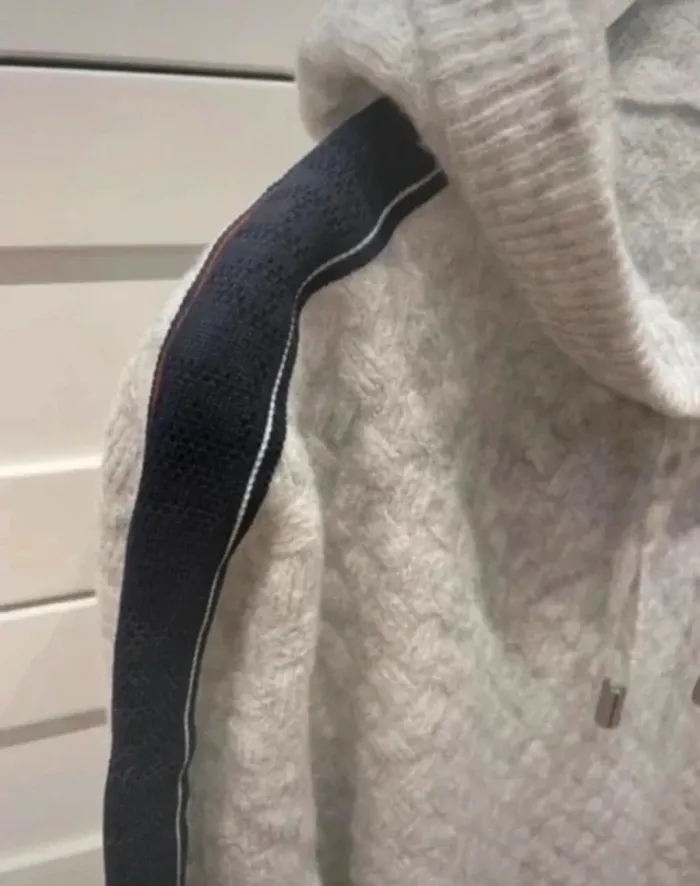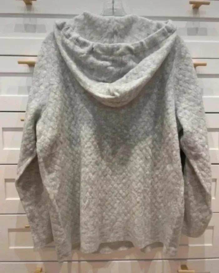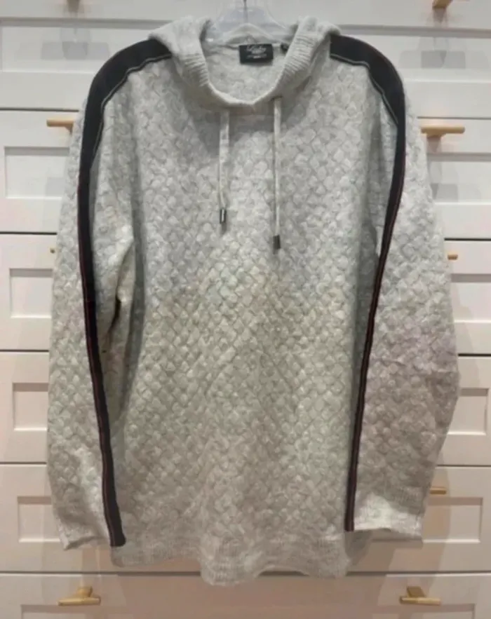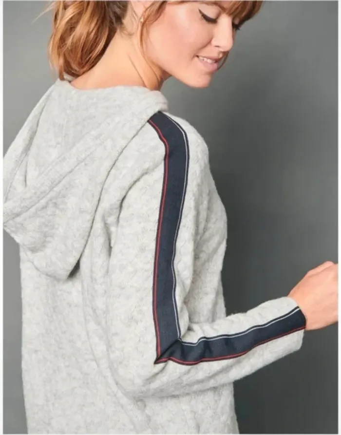 Pull gris clair chiné à capuche. Marque française. Largeur entre les aisselles 57 cm. Composition : 54% Polyester, 38% Acrylique, 5% Laine .