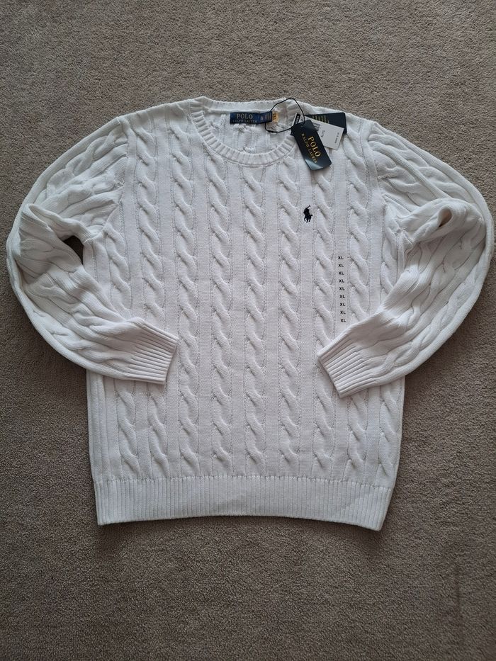 ́pull Ralph Lauren blanc maille torsadée homme taille L Neuf avec étiquettes 100% coton Produit original
