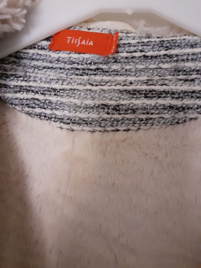 Vends un manteau en maille souple doublé de fausse fourrure, très doux, couleur gris chiné et argenté, intérieur blanc cassé, 55 % coton, 41 % polyester, 3 % viscose, 1 % métal, 2 poches latérales, marque Tissaïa, taille 38-40. Longueur sous aisselle : 57 cm. A noter : petites bouloches mais ne se voient pas.
