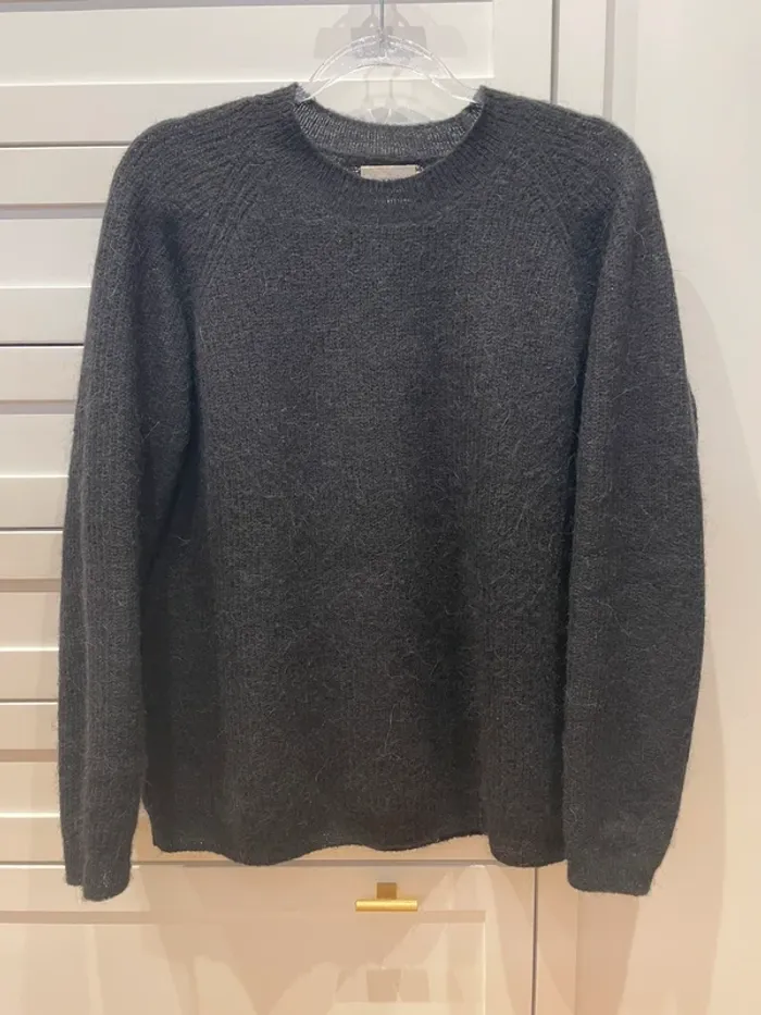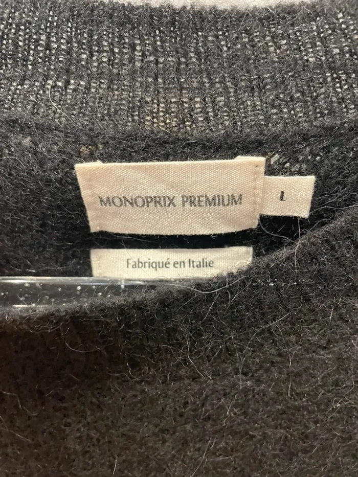 Porté 3-4 fois. Maille duveteuse. Largeur entre les aisselles 56cm, longueur 67cm. Étiquette composition enlevée car gênait. Composition: 33% Polyamide , 30% Laine, 22% Alpaga, 15% Viscose. Lavage en machine à 30°C délicat. ⚠️ Pas de retour.