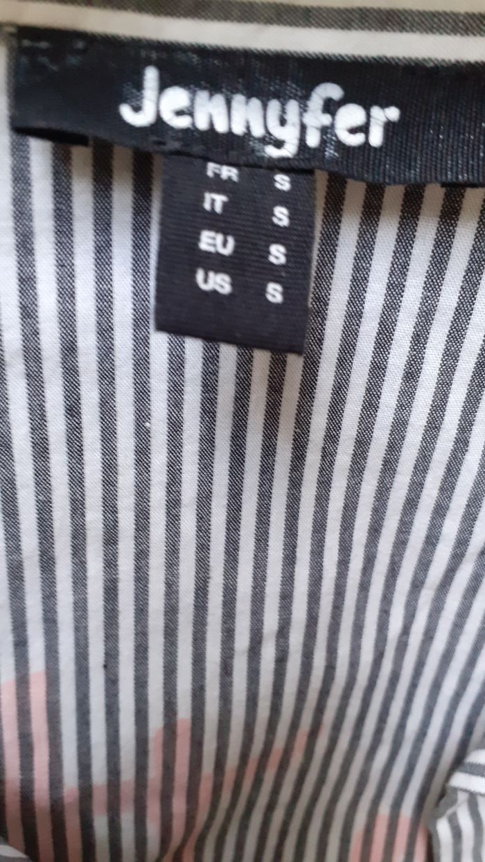 Vends un chemisier manches longues 100 % coton, blanc rayé de gris avec broderie rouge devant et écritures rouges brillantes dans le dos, légèrement arrondi à la base devant et derrière, marque Jennyfer, taille S. Longueur sous aisselle : 34 cm.