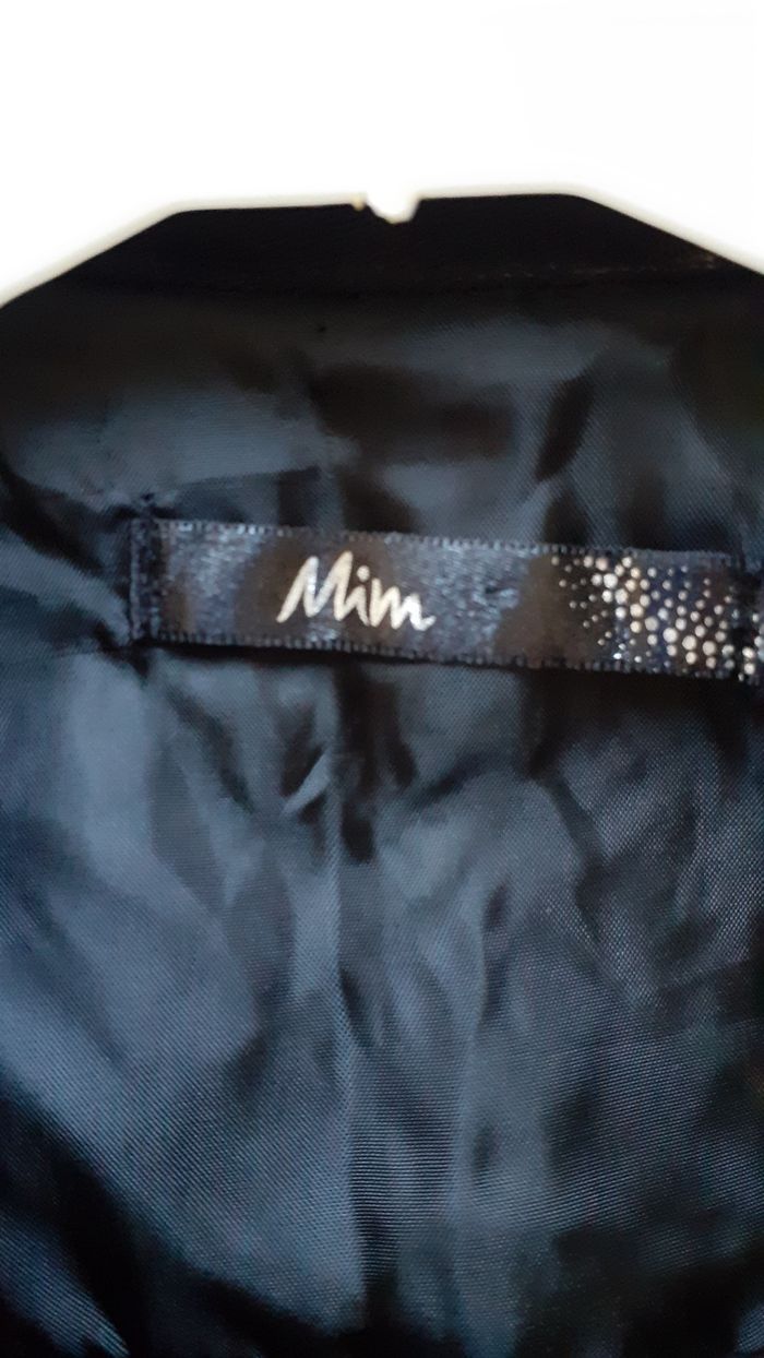 Vends un blazer en coton noir, doublé, forme cintrée, 98 % coton, 2 % élasthanne, 2 poches devant, une fente dans le dos, couleur noir uni, bouton de rechange, marque Mim, taille 38. Longueur sous aisselle : 35 cm.
