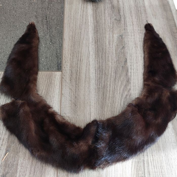 Col vintage fourrure véritable vison ( mink ) brun fonçé avec reflets - composé plusieurs morceaux cousus-effilé au extrémités , style vintage ,montage typique des manteaux années 1950 à 1970,longueur 84 cm- bon état général poils court à mi longs Doublure textile cousu ( montage soigné par un fourreur )