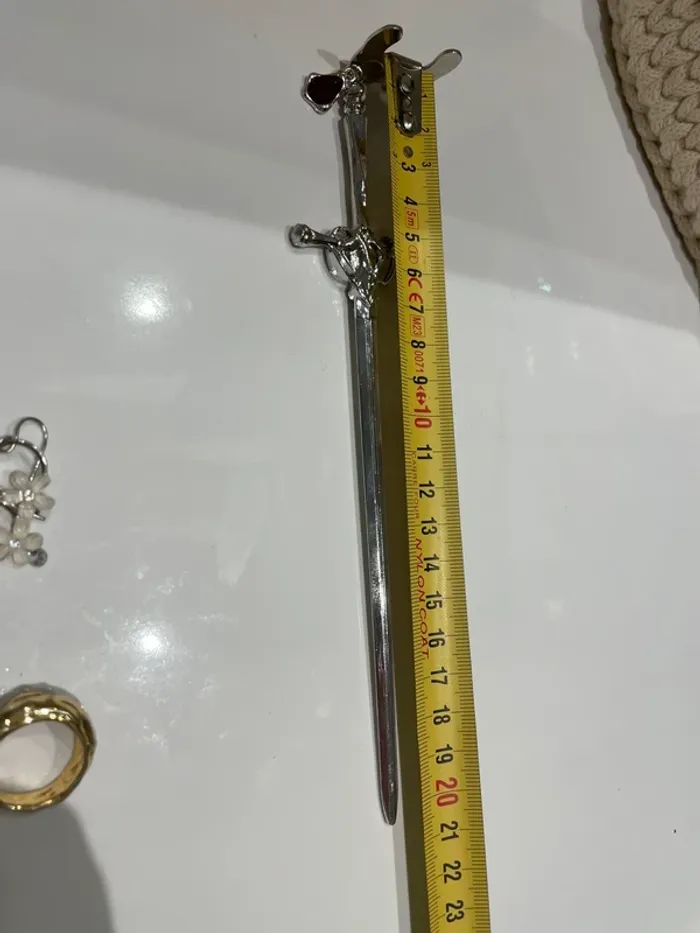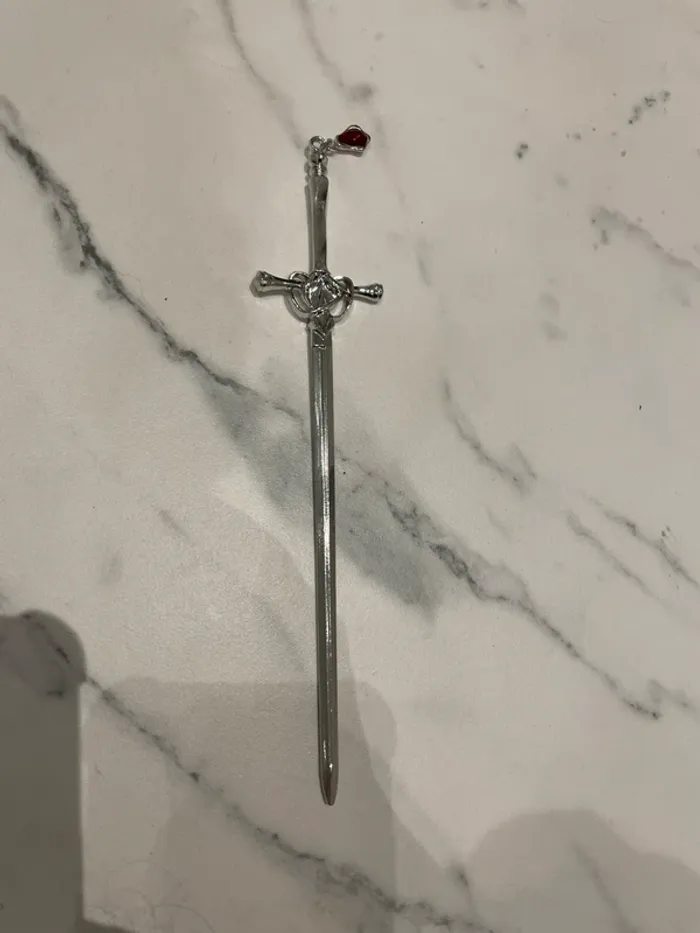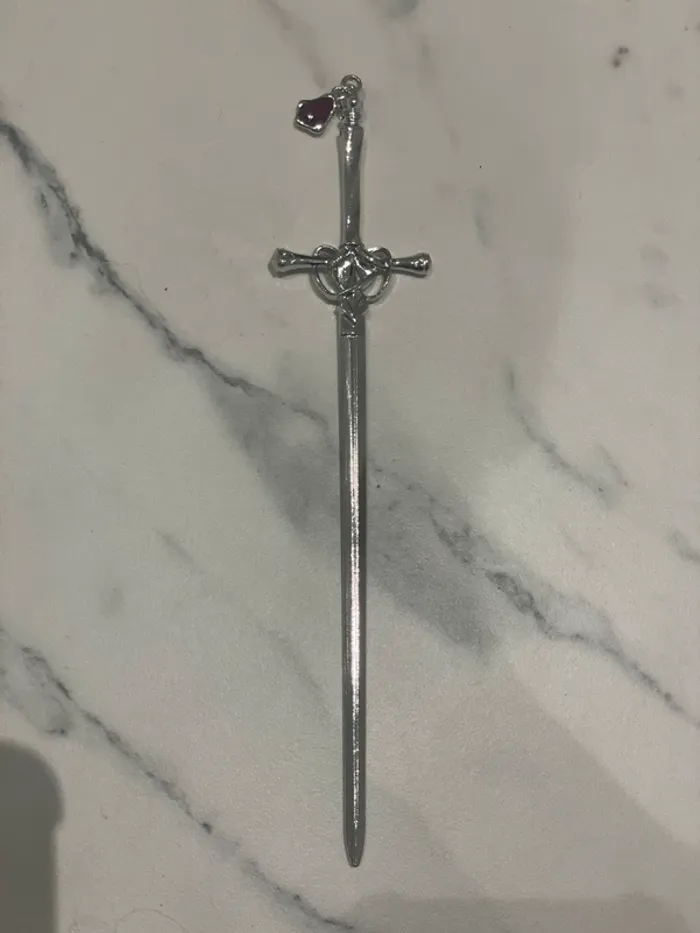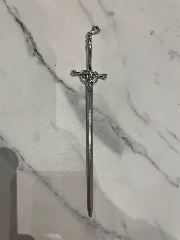 Ce pique à cheveux en acier est conçu en forme d'épée, un mélange de styles médiéval, gothique et witchy. Longueur 20,5 cm.