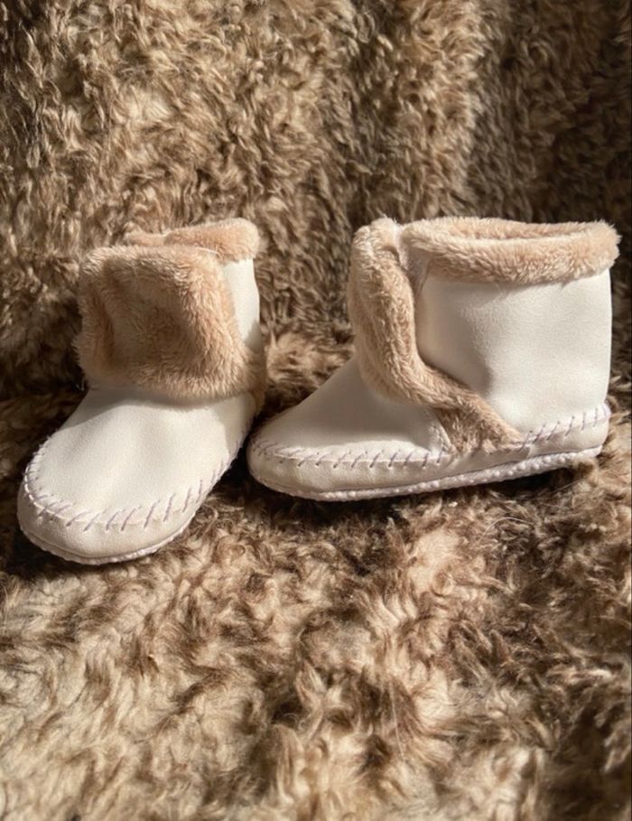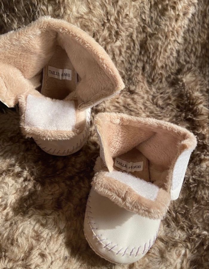 Ouverture avec des scratchs Fausse fourrure interieur Extérieur simili daim blanc tout doux comme du daim Tres bon etat Mixte 3-6 mois