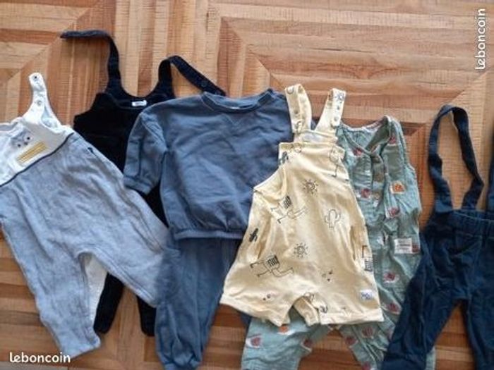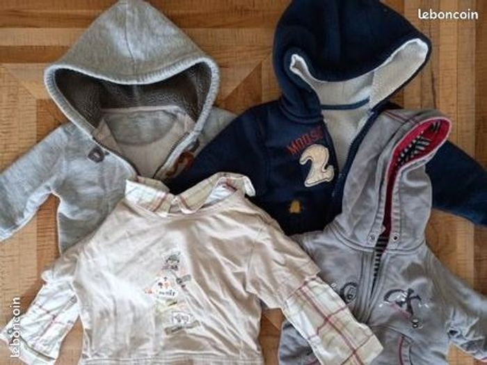 Lot 3 : taille 9 mois, comprend 4 salopettes, 1 combinaison et 1 survêtement, certains légers et d’autres chauds (marques Bout’chou, Baby Bol) + 5 pyjamas (marques Devil Child, Bout’ chou, etc.) en matières plutôt chaudes + 4 gilets à capuches, 1 sweat-chemise, plus ou moins chauds (marques Bout’chou, Sucre d’orge) + 1 combi pour l’extérieur