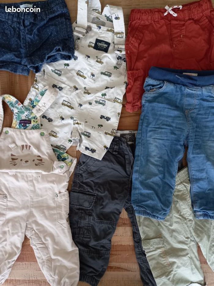 Lot 4 : taille 18 mois, comprend 7 pantalons, jeans, salopette jambes longues, salopette jambes courtes (marques Bout’chou, H&M, Sergent Major, etc.)