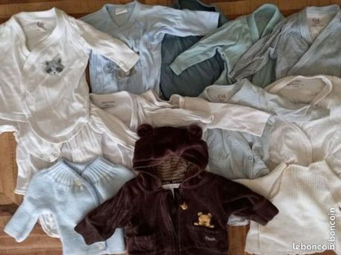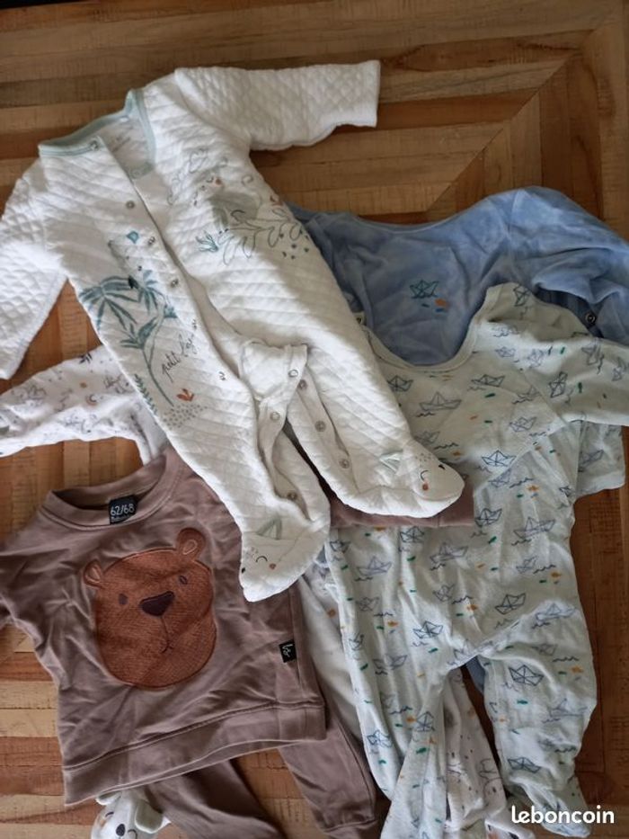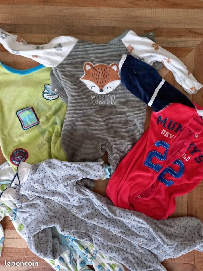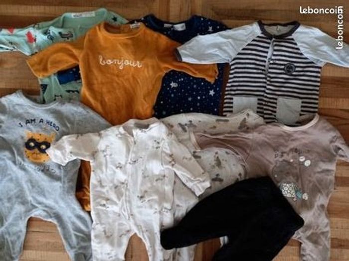 Lot 1 : taille 3 mois, comprend 8 pyjamas , marques Bout’chou, Minoti + 10 bodies manches longues, 2 pulls légers et 1 sweat-shirt à capuche (marques C&A, H&M, Bout’chou) + 1 combi pour l’extérieur