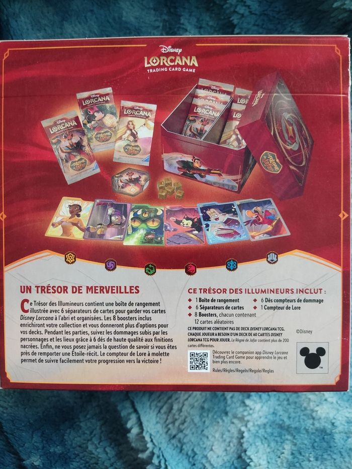 Coffret de cartes Disney Lorcana Le Régne de Jafar Contient 1 boîte de rangement, 6 séparateurs de cartes, 8 boosters de 12 cartes chacuns, 6 dés compteurs de dommages et un compteurs de Lore Envoi protège dans du papier bulle Ouvert à tous les transporteurs