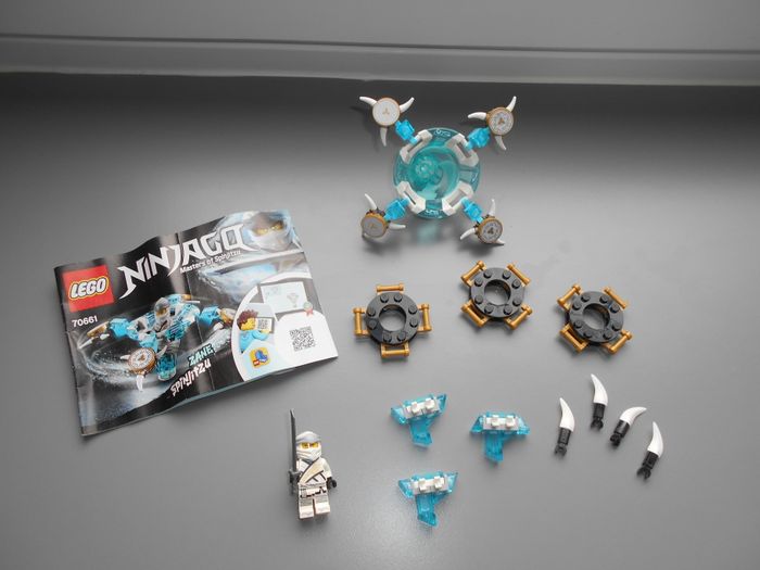 Vends ce Lego Ninjago n°70661: Masters of spinjitzu (toupie), avec notice, sans boite, (manque juste une piéce bleu: sur les 4, il en manque une, voir seconde photo), ce qui n'empêche en rien le bon fonctionnement du jeu.