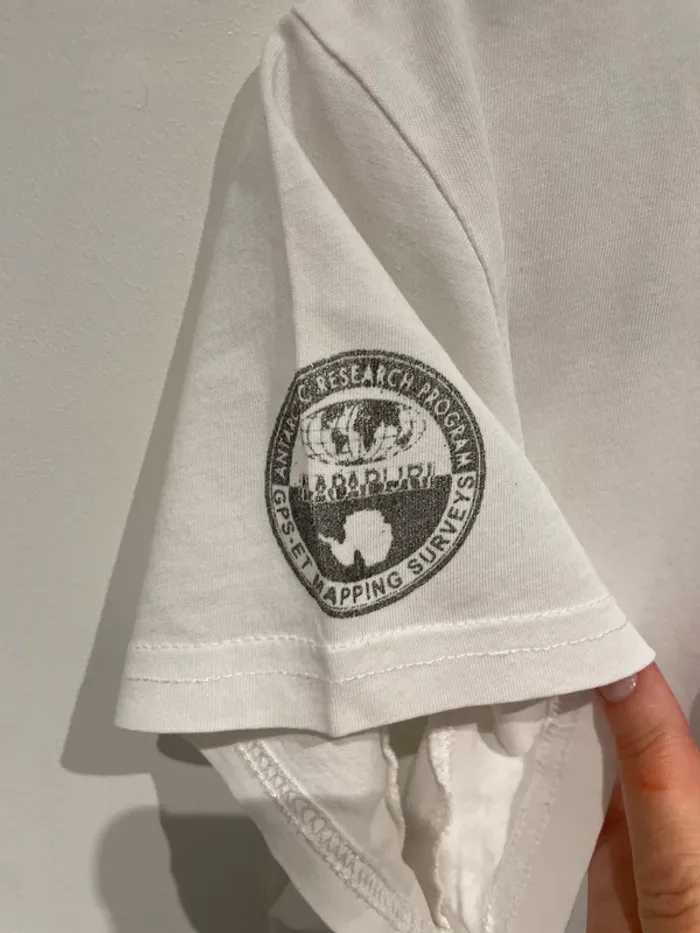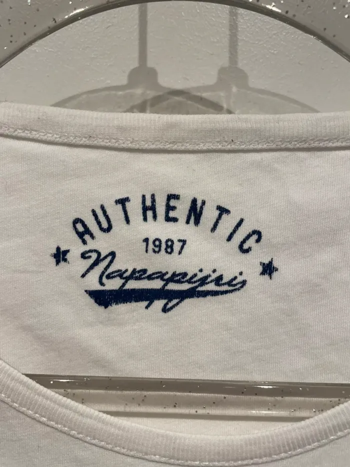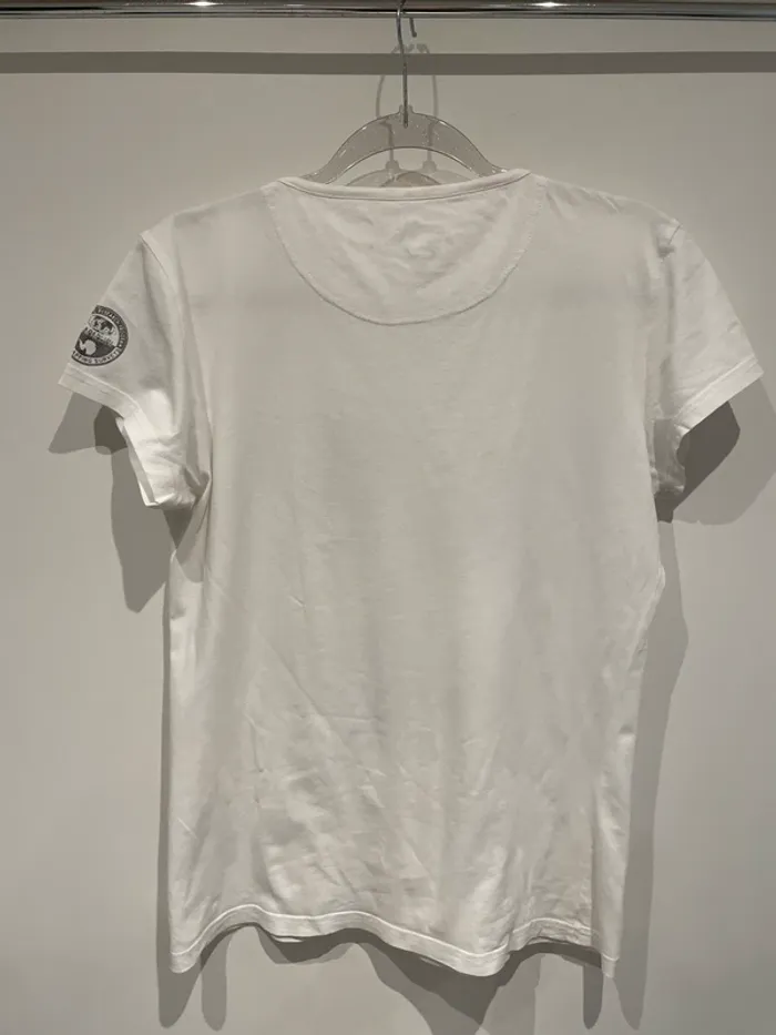 T-shirt blanc drapeau à paillettes. Largeur entre les épaules 43 cm, longueur 66 cm.